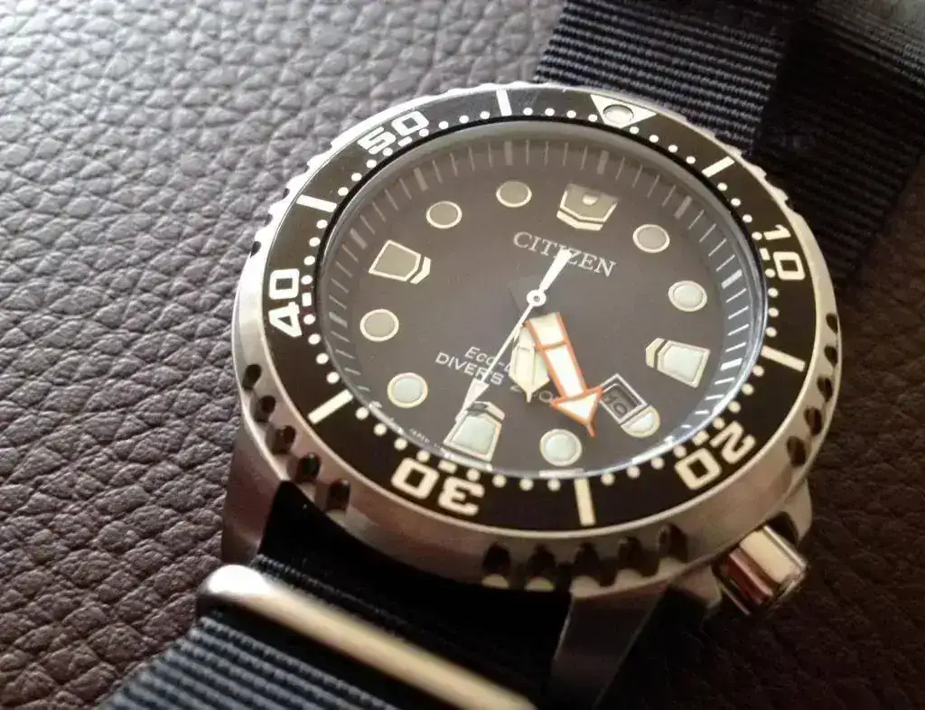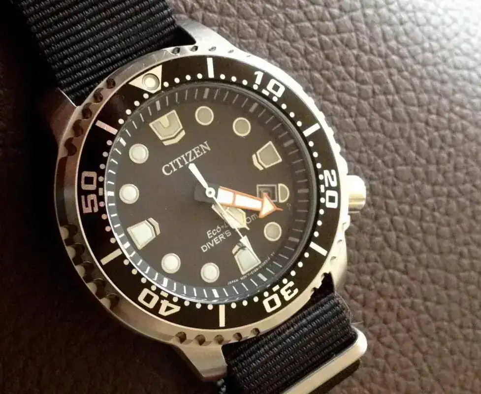 En cuanto al lume, el famoso lumen azul de Citizen (excepto la perla del bisel, verde), bastará que os enlace el último vídeo de Just One More Watch, en el que precisamente enfrenta este reloj en una "lume war", una comparación de lúmenes con otros relojes, en la que este económico diver resulta ganador frente a Rolex, Zelos, O&W, Oris, Seiko, Draken y Dificiano.