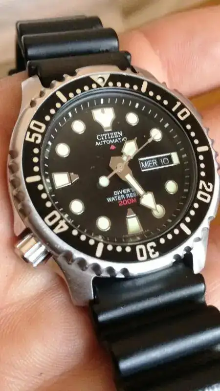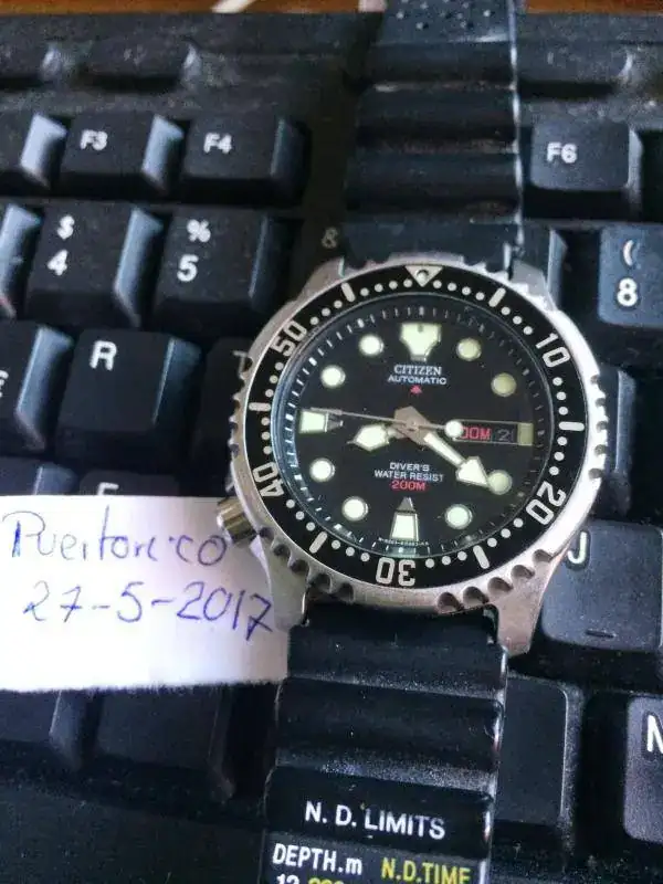 )El reloj yo no lo veo marca alguna ni en bisel ni en cristal. Es un reloj que como sabeis es un intocable, increible su lumen. Su correa esta muy bien conservada.