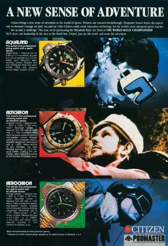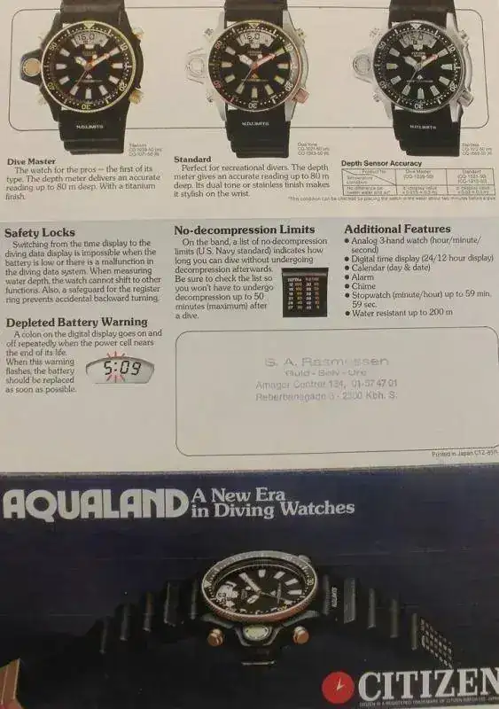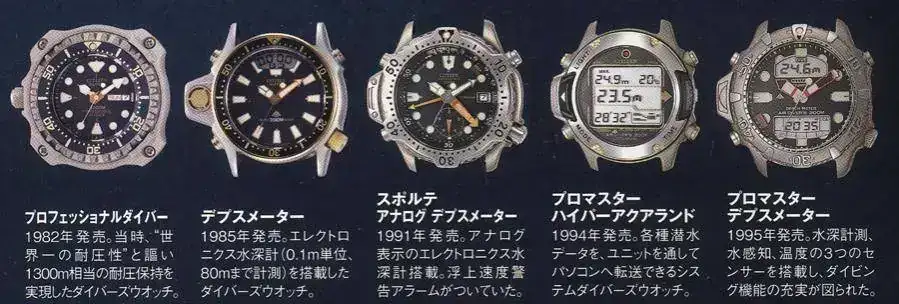 En enero de 1986, Citizen lanzó el primer reloj de buceo con medidor de profundidad electrónico, el Aqualand.