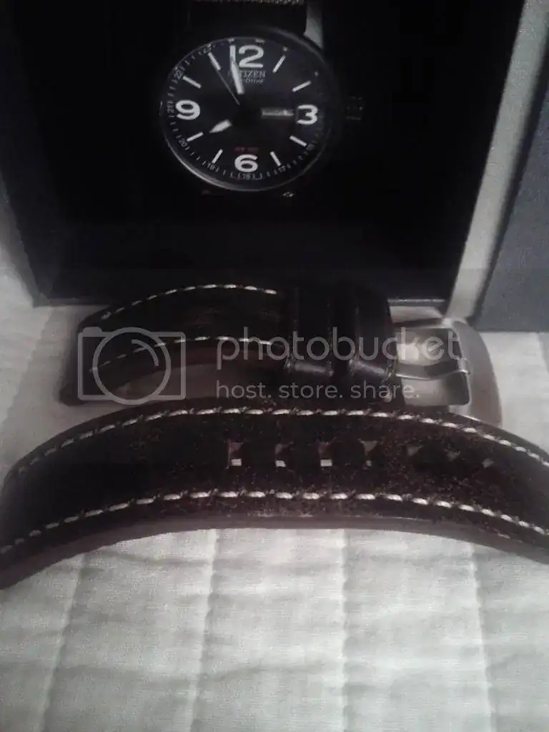 Junto a este reloj, os doy la posibilidad de comprar también una correa que creo que le quedará genial. Es una correa gordita, y muy cómoda, con un estilo "viejuno" (con la piel "agrietadilla"). Al vender el reloj, la correa ya no me "vale" para ninguno de mis otros relojes. La correa está sin uso. Fue montada en otro reloj para ver que tal le quedaba, y desmontada al día siguiente, ya que el experimento no me gusto... Os pongo unas fotos donde podéis verla: