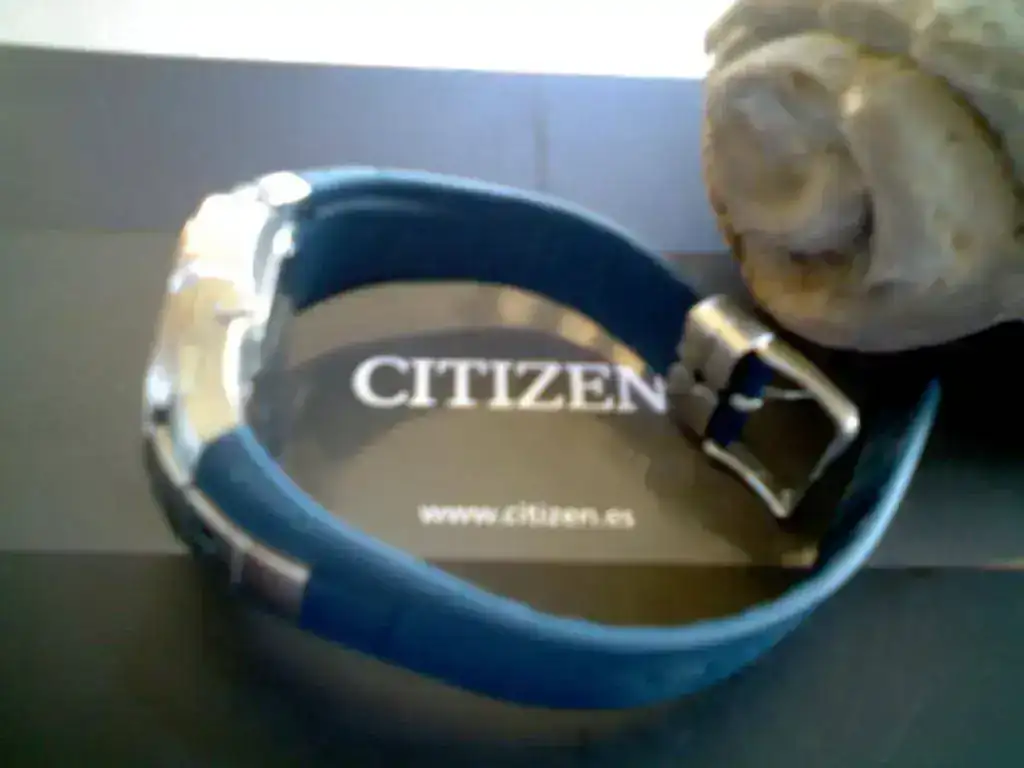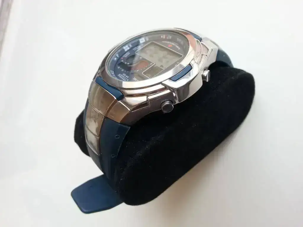 Reloj calendario, alarma, cronómetro, dos cuenta atrás, luz azul electroluminiscente muy bonita. WR100 aunque obviamente no lo garantizo expuesto lo anterior. Correa azul marino original y en muy buen estado.