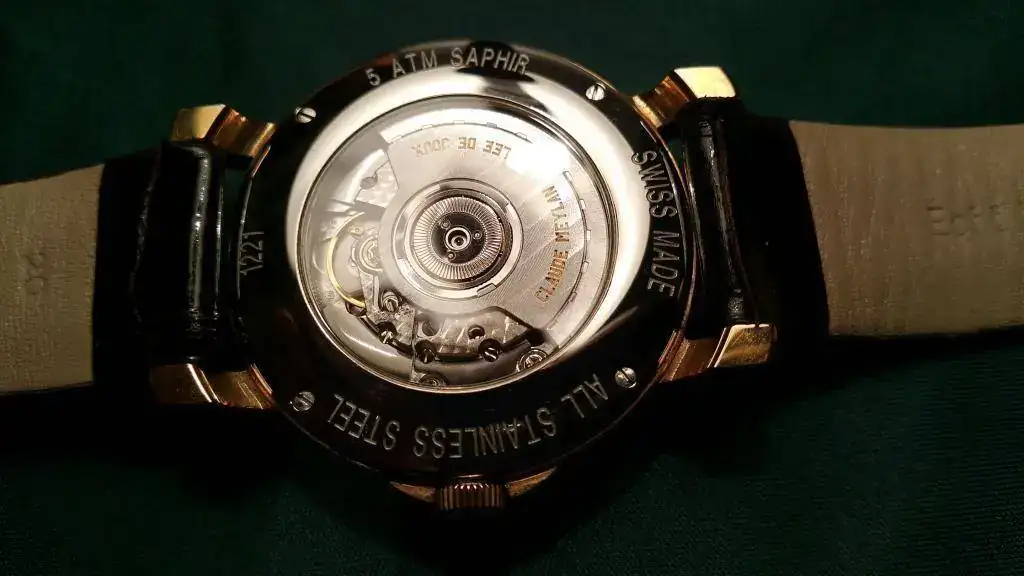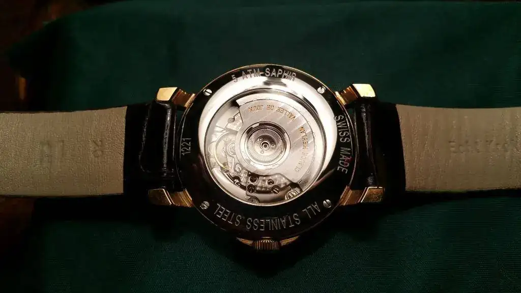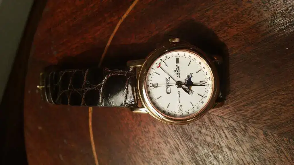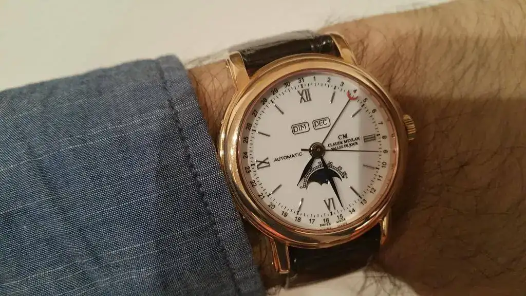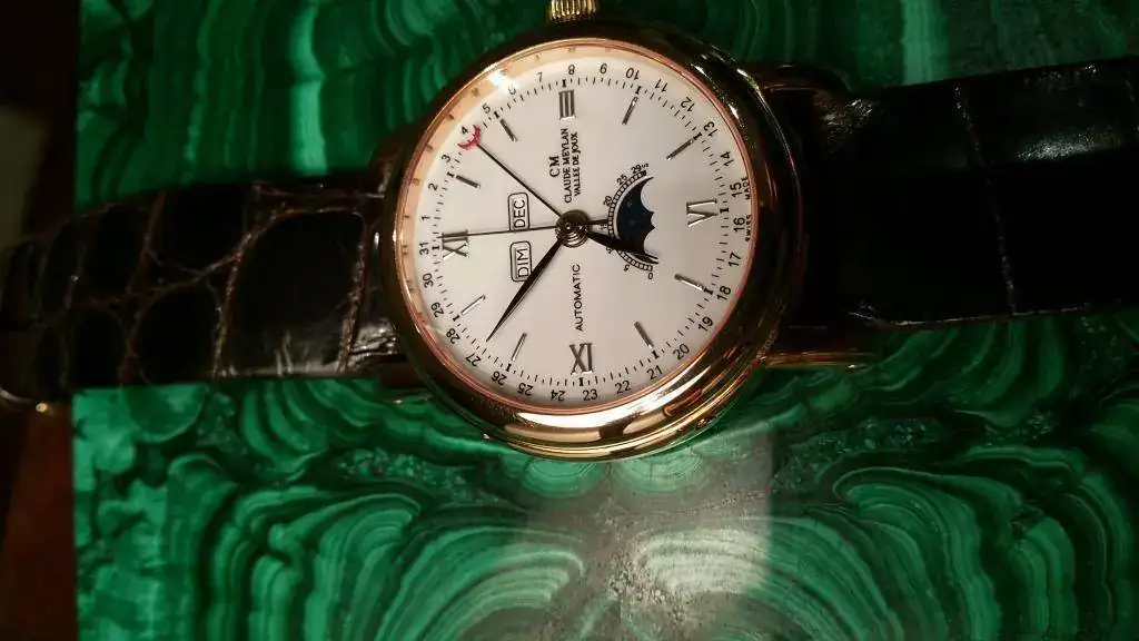 Pongo a la venta este interesante y poco visto Claude Meylan,una marca más conocida por sus esqueletos.Yo soy su segundo propietario,y no tiene caja ni documentación.El reloj funciona perfectamente y es una preciosidad,al menos para mí.La correa de cocodrilo no es original,y apenas tiene uso.El estado del reloj es de 8 sobre 10,el chapado en oro muestra las microrayas típicas de un uso ligero.No está nuevo,pero para darse cuenta de ello hay que mirarlo muy de cerca.El reloj es ideal para vestir,y una buena oportunidad para alguien interesado en la complicación de fase lunar a un precio muy ajustado (este modelo,nuevo,tiene un pvp de más de 3500 euros) Y sin más,las fotos.La ficha,abajo.