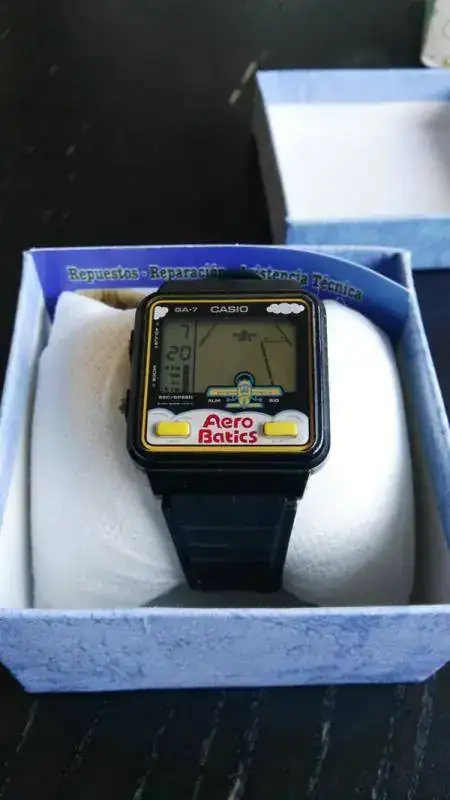 Se trata del Reloj Casio con Videojuego GA-7, o lo que es lo mismo y os sonará más, el popular “Aero Batics”. Un modelo que, como todos los Casio con Videojuego se ha convertido en un casi imposible de conseguir, debido al subidón de precios que han experimentado estos últimos años. Ahora conseguir uno de estos modelos antiguos con videojuego te obliga a desembolsar varios cientos de € y si además está en un estado como éste, el valor sube unos cientos más.