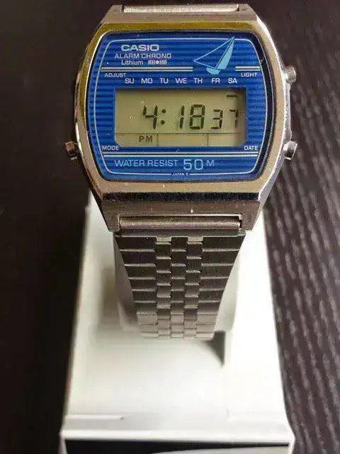 Este Marlin es una maravilla de hace más de treinta años. Probablemente es de los primeros Marlin Saliboat (logo del barco) que se editaron en un espacio comprendido entre 1978 y 1980. Su antiquísimo módulo 81 es compartido por varios eslabones perdidos entre los Casiotron y los Marlin editados a finales de los años 70, por ello es muy probable establecer su fecha de lanzamiento en esta franja de 2 años. Las versiones Marlin en su mayoría se editaban en una versión negra y otra azul. Ésta última era muy difícil de ver, ya que la primera era la "A" o estandar. En este caso he conseguido una pieza bellísima con la que cierro la serie Marlin Saliboats. Los 4 barcos están en posición rumbo espero al infinito.