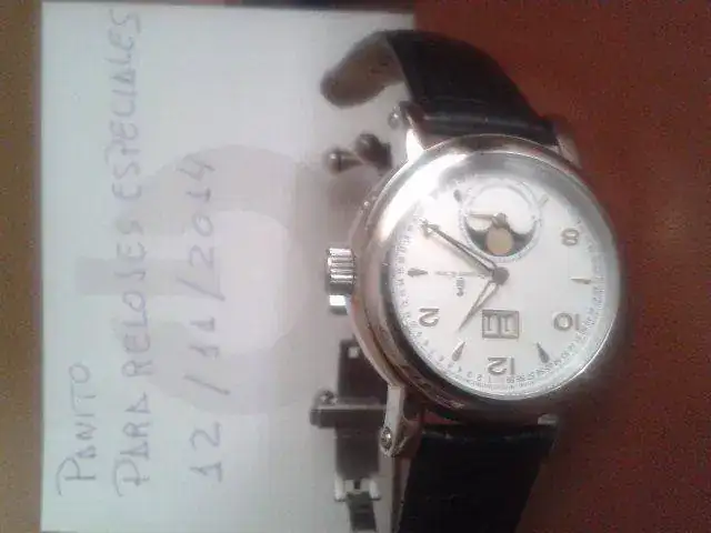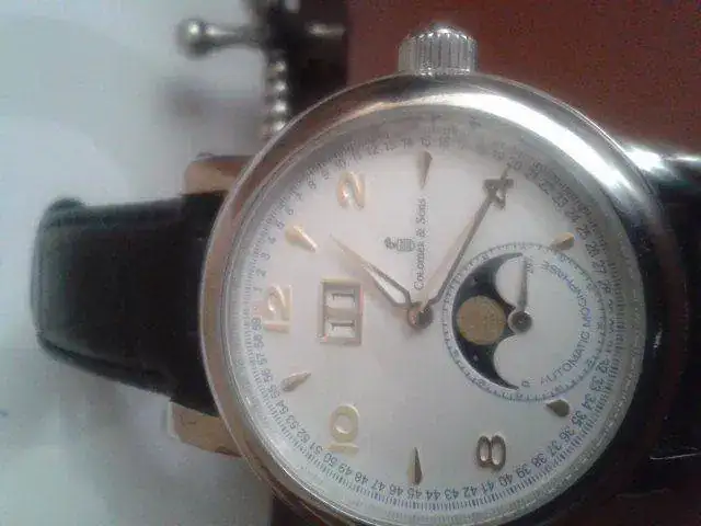 Buenos días pongo a la venta este Colomer , con tres puestas , tiene un fases lunares autentico- no un noche dia - y un gran date precioso remarcado en dorado , las agujas son delfin con lumen y tiene una marcha incleible + 5 seg dia o 24 horas , mas de 40 horas de reserva de marcha y con garantía vigente . Me costo 270 euros , pero esque tengo tres con fases lunares , y creo que me faltan días para ponerme todos los relojes que tengo . Prerfiero que lo disfrute alguien que sepa apreciarlo .