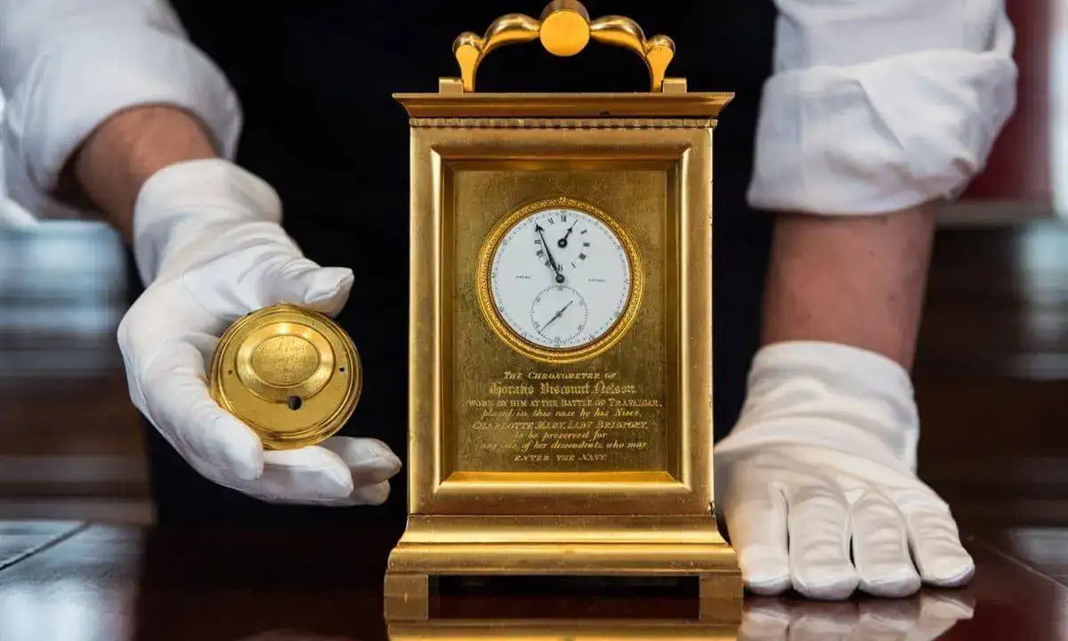 Comienzo con el reloj usado por el propio Lord Nelson durante el citado combate. Aparentemente, lo llevaba cuando fue herido de muerte en Trafalgar y estaba en una lista de sus efectos personales que, al regresar su cuerpo a Inglaterra, fueron inspeccionados por su hermano, William, en presencia de Lady Hamilton que era la amante/pareja de Horatio Nelson. El reloj fue heredado por dicho hermano, y en 1835 su sobrina Charlotte Mary Nelson, fue quien hizo colocar el reloj en la caja en la que actualmente sigue encastrado, con la inscripción: "El cronómetro de Horatio Viscount Nelsón, usado por él en la batalla de Trafalgar, colocado en esta caja por su sobrina Charlotte Mary, Lady Bridport, para ser preservado para cualquiera de sus descendientes, que pudiera ingresar a la Marina".