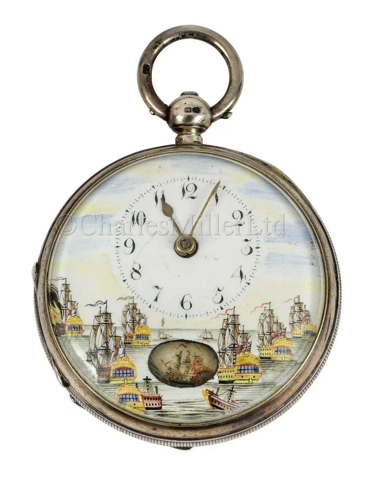 Siguiendo un orden cronológico en los relojes a comentar, me he encontrado este bonito reloj conmemorativo que datan cercano al 1810. Consta de una caja externa de plata de 50mm de diámetro y un dial policromado realizado en enamel/esmalte que representa el combate de Trafalgar; como curiosidad tiene una ventana oval que deja ver, gracias a un sistema rotativo, un bonito desfile de 3 diferentes "buques de linea" de la época.