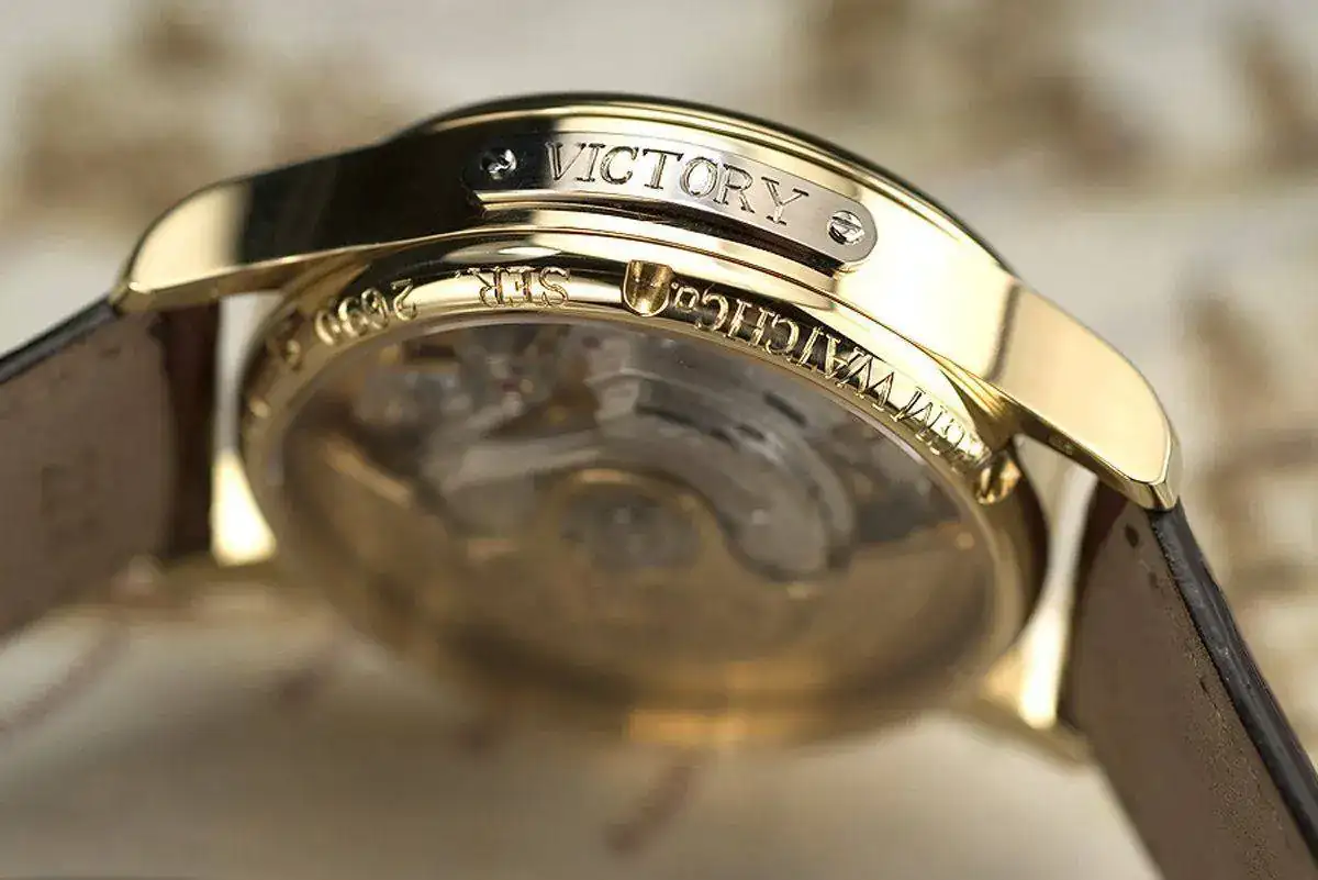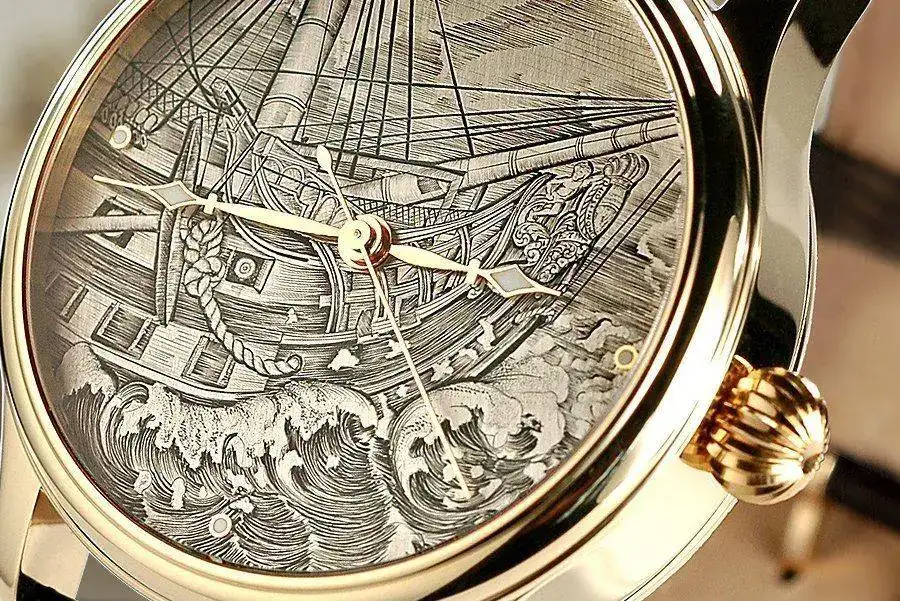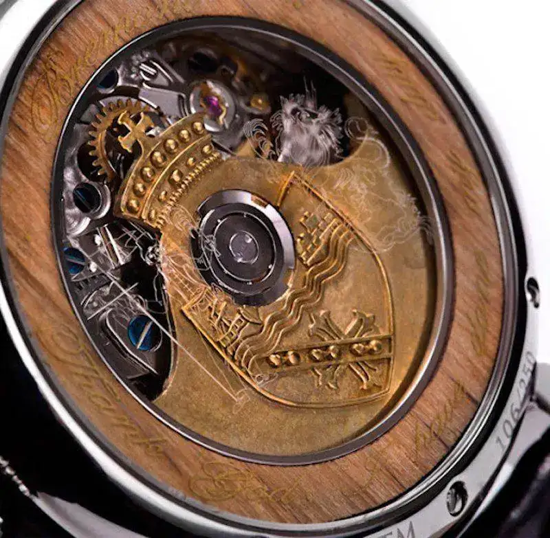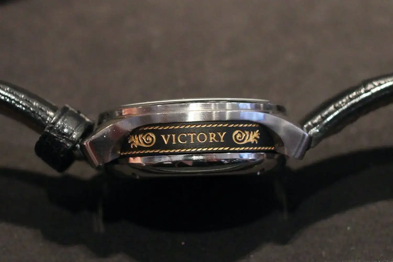 Las cajas tienen 42 mm de diámetro y están fabricadas en oro amarillo de 18k con una placa de oro blanco (situada en el lateral izdo de la caja) para mostrar el nombre "Victory". Una tapa de caja transparente con un grabado a mano conmemora la fecha de la batalla de Trafalgar y permite una vista sin obstáculos del movimiento automático modificado Valgrangres 16.5. El movimiento está adornado con guilloché auténtico, un rotor de oro macizo grabado con una representación del mascarón de proa del barco y su lema: "Honi Soit Qui Mal Y Pense". Una preciosa combinación de grabado a mano, guilloché torneado a mano y atención a los detalles que RGM le ha dado a cada uno de los seis relojes producidos para dicha ocasión.