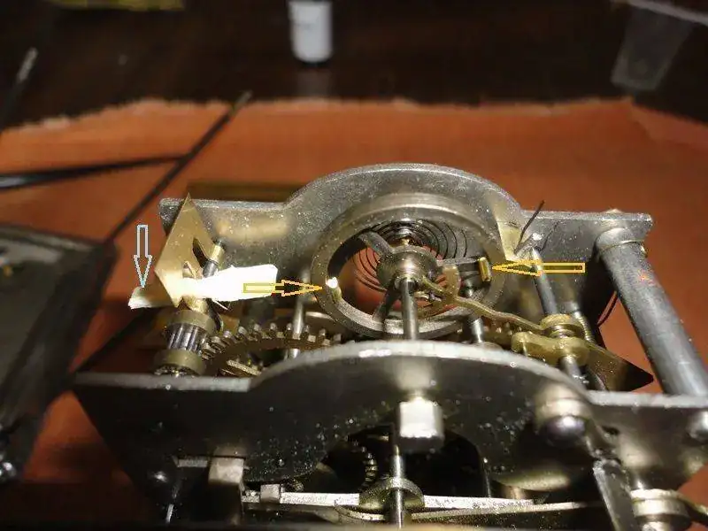 En mi caso, a pesar de haber corregido la espiral, mi reloj seguía adelantando. Observo el muelle real y compruebo que no es el original, probablemente de ahí el adelantamiento de la hora. Procedí a regularlo por mi sistema de lastres en el volante, pero además los toques horarios eran muy rápidos, así que para hacerlos más lentos, añadí resistencia al venterol con unos mondadientes planos. Ya se que hay muchos puristas y, de estos arreglos expeditivos, dirán que no son muy relojeros, pero funcionan y no se ven, además soy de ir por la calle.