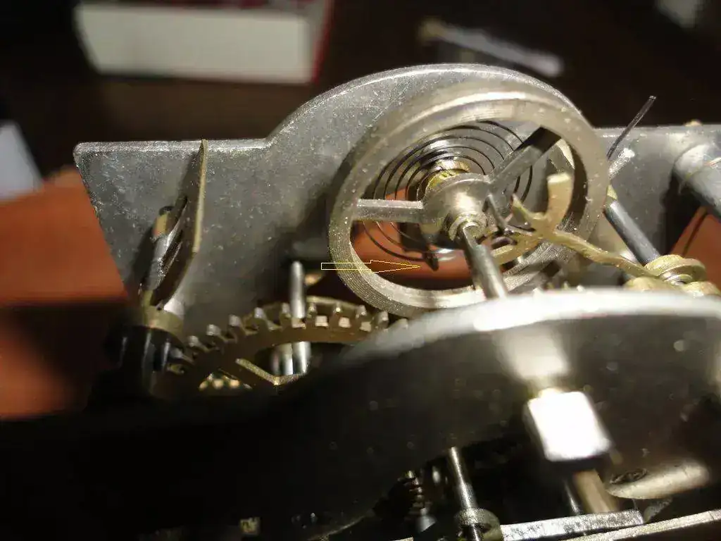 Observa en el enlace que te adjunto la fotografía -"16ª.- Lastre de latón en el volante para ralentizar la velocidad de giro y corregir el adelanto del reloj."-