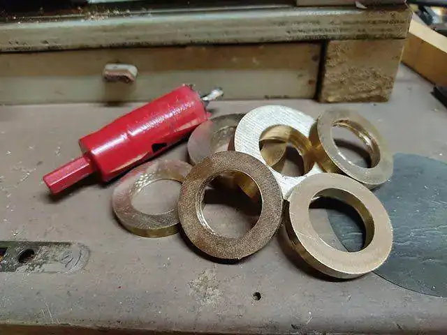 Como siempre, empezamos con los discos de latón. En este caso y para ahorrar faena he taladrado el centro usando una broca de 25mm