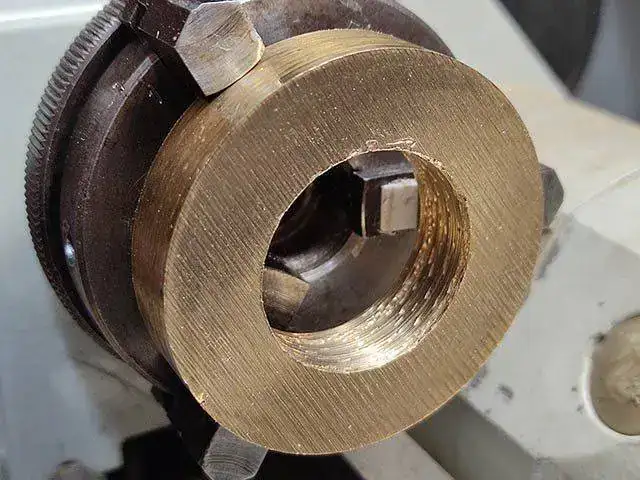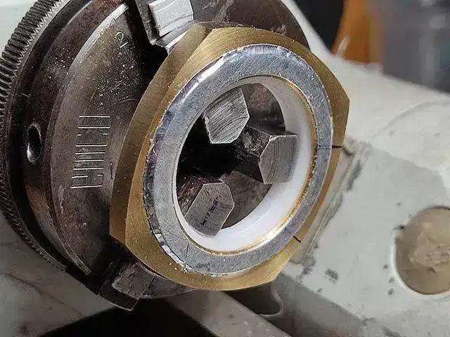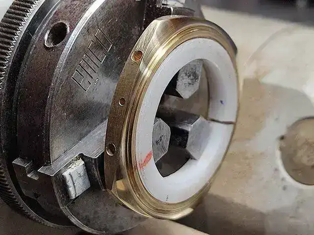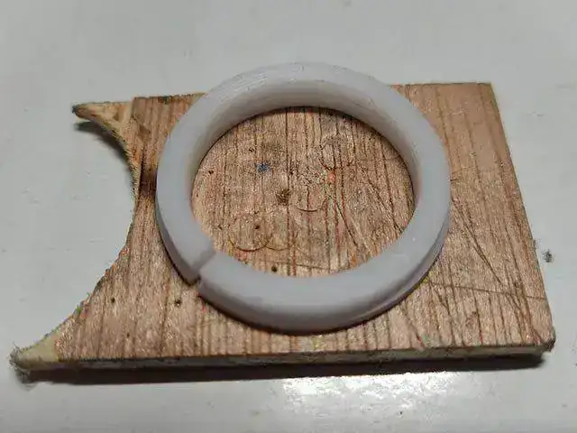 Por último, y para poder dar la forma definitiva, he fabricado una bata en delrin que me permitirá sujetar la caja al torno sin dañar las diferentes secciones interiores.