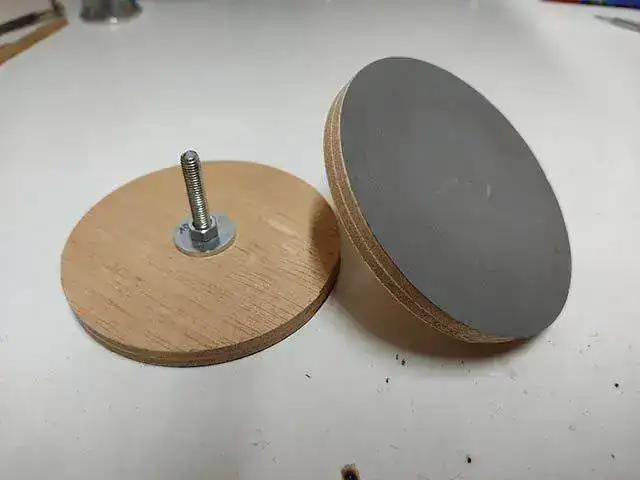 Hecha la aproximación hay que ajustar. Para eso he fabricado unos disco de madera a los que he pegado papel de lija de diferentes granos. El resto un poco de trabajo en el torno.