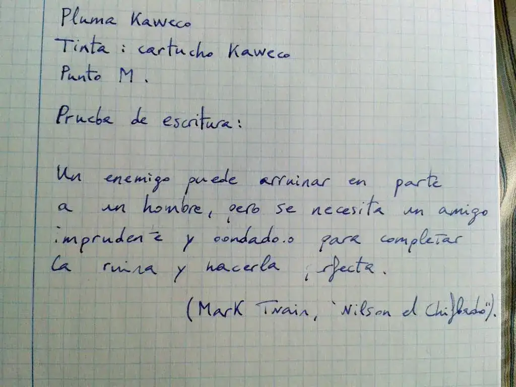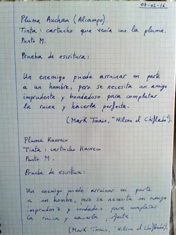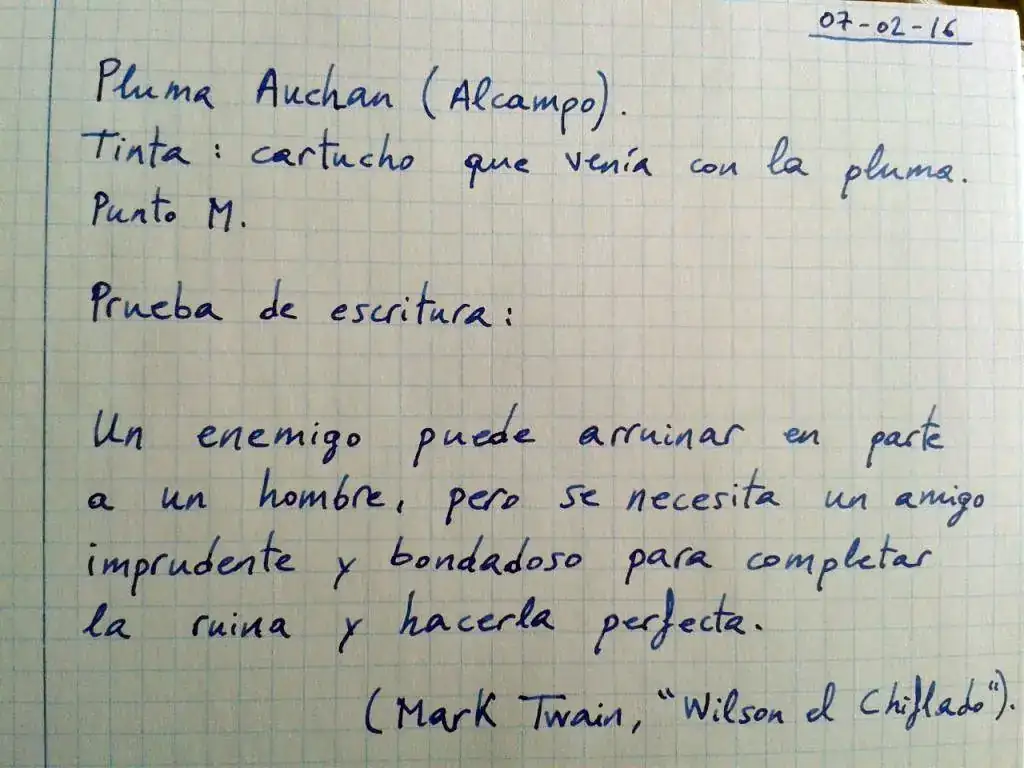 No hace mucho me compré una Kaweco Sport y como vi por aquí y un amigo también me comentó que hay plumas baratillas, de hipermercado, que no tienen ni nombre, y que sin embargo dan buenos resultados, me compré también una pluma de Alcampo que me costó entre 4,5 y 5 € (no recuerdo exactamente). Ahora mismo es la que llevo al trabajo porque es cómoda para llevar en un bolsillo, el capuchón cierra con consistencia y posteada permite un manejo cómodo. Para escribir una breve nota tampoco resulta incómoda sin postear pero ésto ya depende de la mano de cada uno. La estoy llevando al trabajo porque en la oficina no tengo ocasión de escribir a mano casi nada, todo va por ordenador y esas cosas, y estar desenroscando y enroscando la Kaweco para escribir 4 números o un par de palabras cada hora pues no me gusta. Además, si ésta desapareciera por algún motivo es barata de reponer.