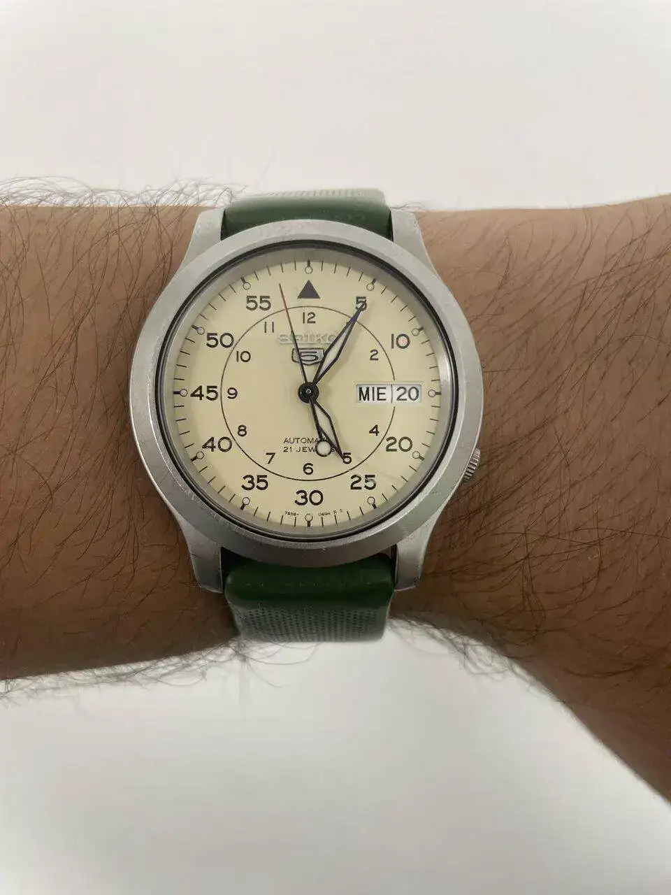 En mi caso tengo un Seiko 5 Military de 36mm con el calibre 7S26 (perdonad la correa de la foto pero con mi trabajo se deterioran mucho y se llenan de crema y grasa). Creo que podemos decir que es la versión field del suyo.
