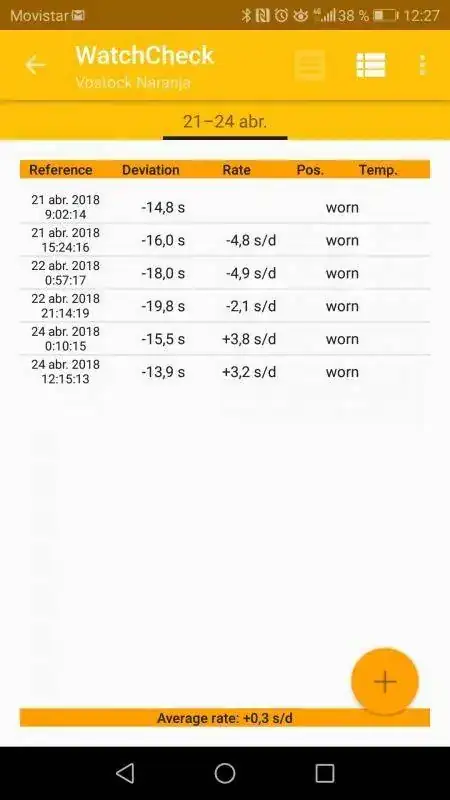 El valor en naranja del pié de la captura, es el desvio medio en ese tiempo, es decir, el desvio final medio al dia,el resultado vamos. Y el de la derecha de la parte alta, de la segunda columna, es el desvio estimado diario, si se mantiene en esa posición concreta, como es de esperar en estas gamas, hay variaciones entre llevarlo puesto o descansar en ciertas posisiones. Aunque eso pasa hasta en gamas altas Suizas.