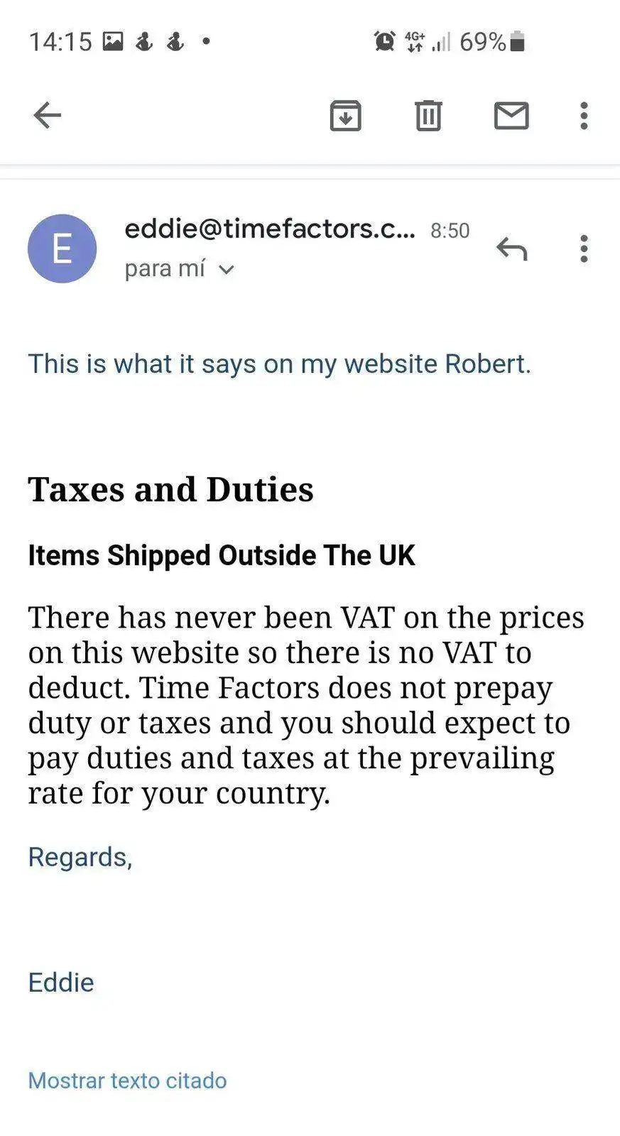 El caso es que me pongo en contacto con ellos para preguntarles si descontarían el vat ya que al llegar a España ya me haría cargo yo del iva.