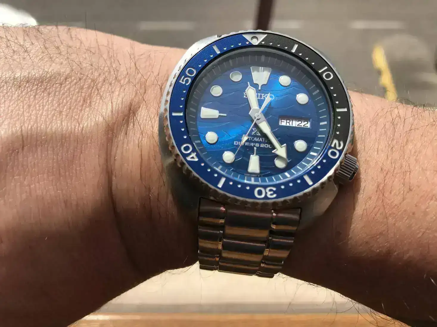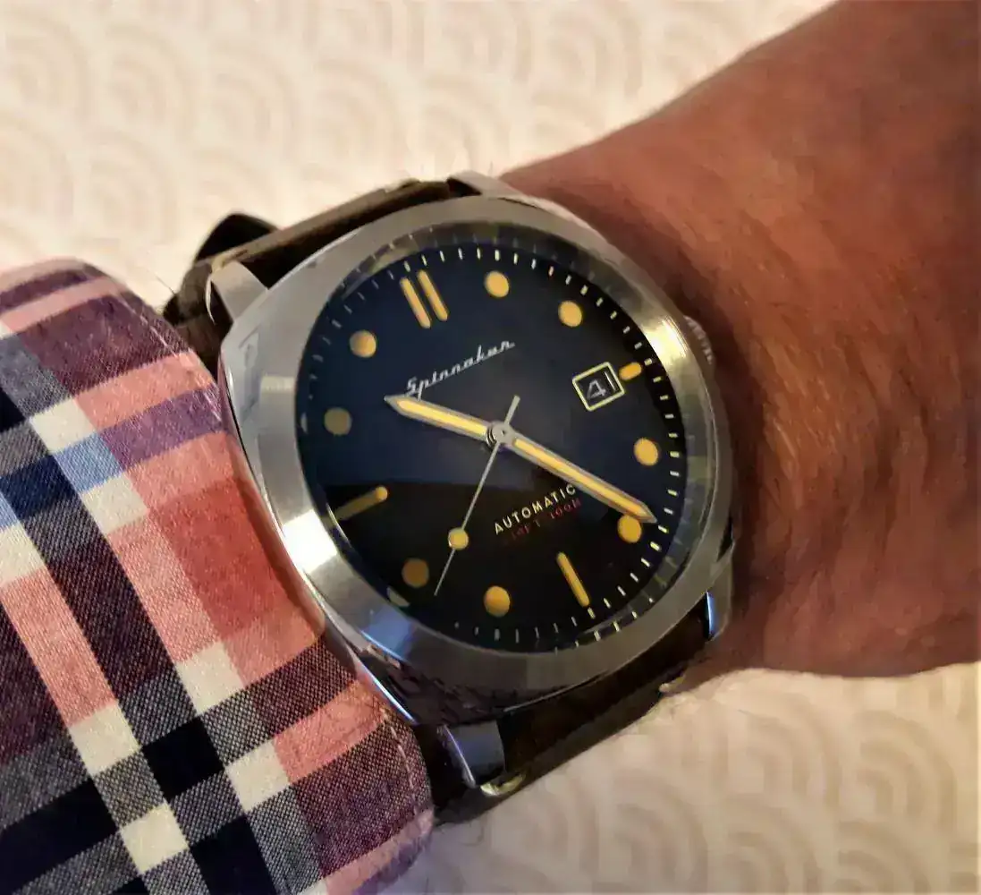 En mi caso ha caído un Spinnaker Hull SP-5059-02. Movimiento Seiko NH35. Cristal mineral. Corona roscada, resistencia al agua 100 Mtrs. Esfera marrón con un degradado precioso. Lumen justito pero aceptable. La correa es de cuero de bastante calidad, aspecto vintage, es bastante gordita pero cómoda, en breve me haré con una de aligátor marrón oscuro de grano pequeño, me gusta tener dos pantalones para mis relojes. La caja es de acero de 42 mm, fondo visto, y las asas son bastante cortas con lo que para nada queda grande en una muñeca pequeña como la mía.