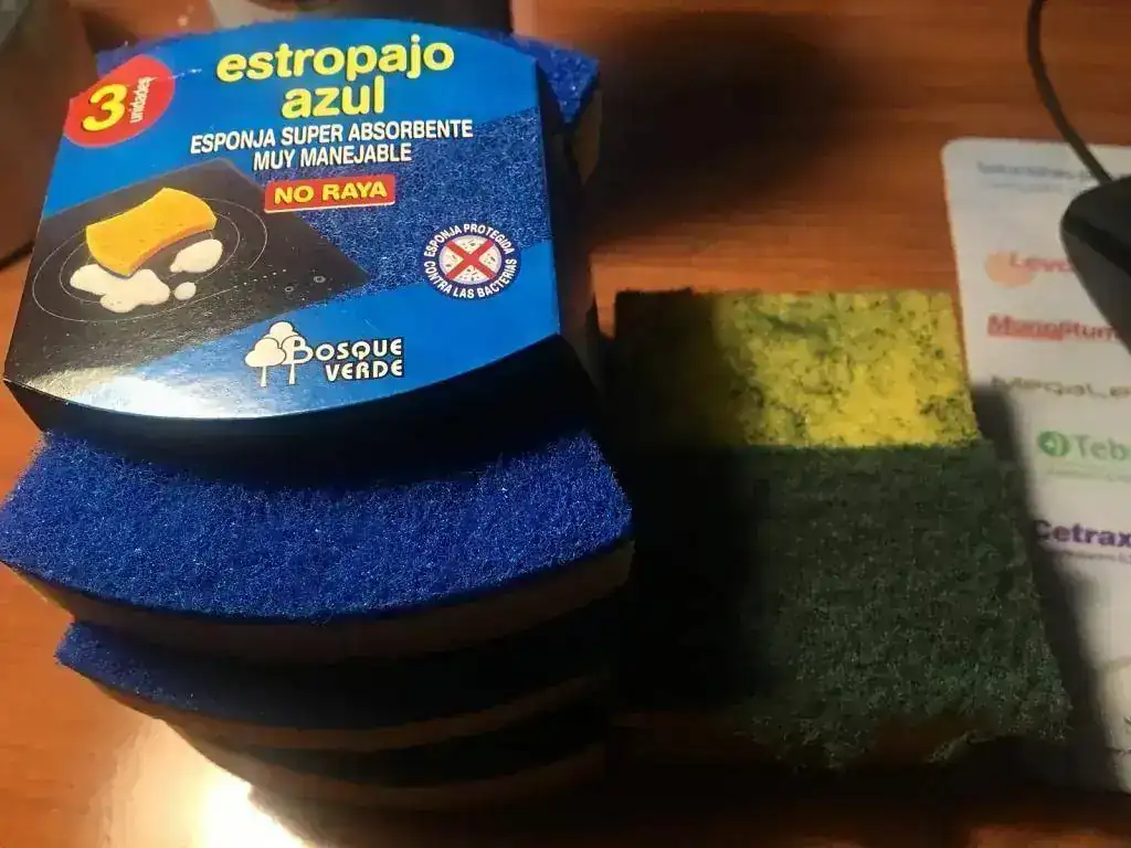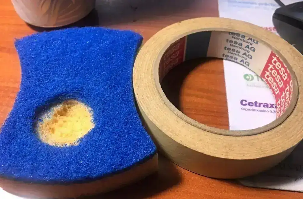 En primer lugar, me paso por un chino para comprar un cutter y cinta de carrocero para cortar el estropajo (el mismo bisel sirve de molde) y cubrir el cristal, respectivamente.
