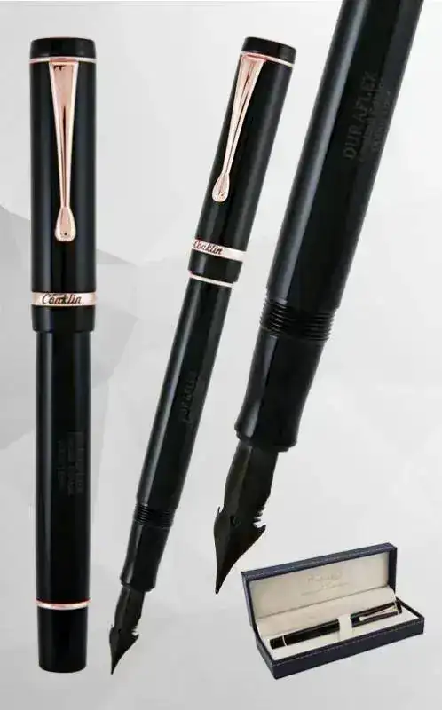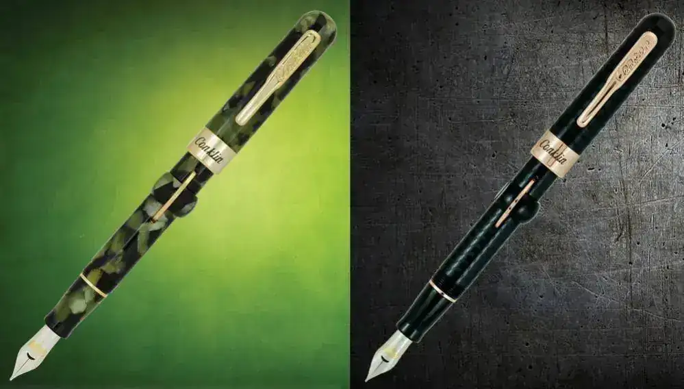 La nueva Conklin ya ha explotado el modelo original Crescent filler, copiando su aspecto básico (que no sus materiales ni sus plumines emblemáticos y extraordinarios) en versiones más convencionales en cuanto a colores. He aquí un imagen de dos de esas versiones modernas, las más conservadoras y fieles al original, especialmente la de plástico negro: