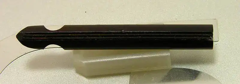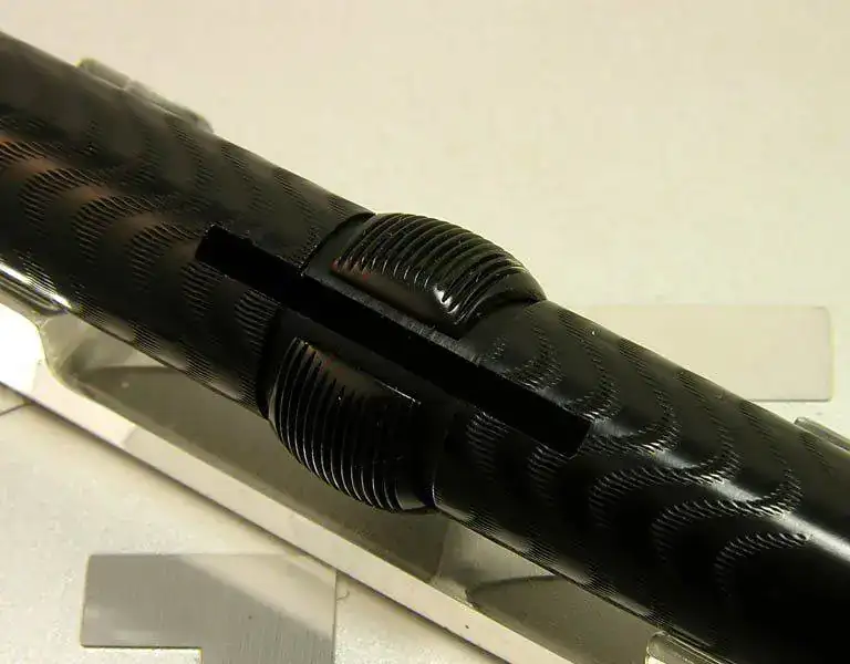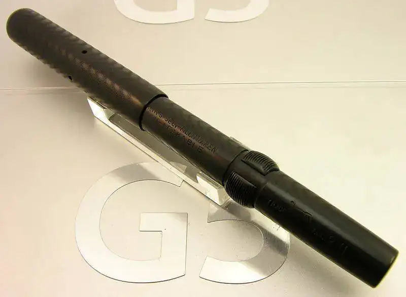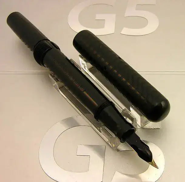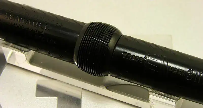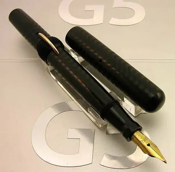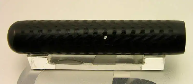 Este modelo que presento no lleva ningún anillo metálico ni otro decorado más que el acabado de la superficie de la ebonita grabado en ondas. El hecho de no llevar clip en la capucha la hace un poco menos frecuente de lo normal. Las únicas partes metálicas son el plumín de oro de 14 kt y el medio disco que permite la compresión del saco de goma interior para permitir el recargado de tinta.