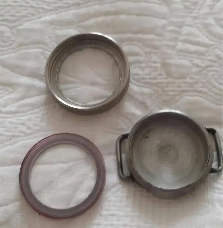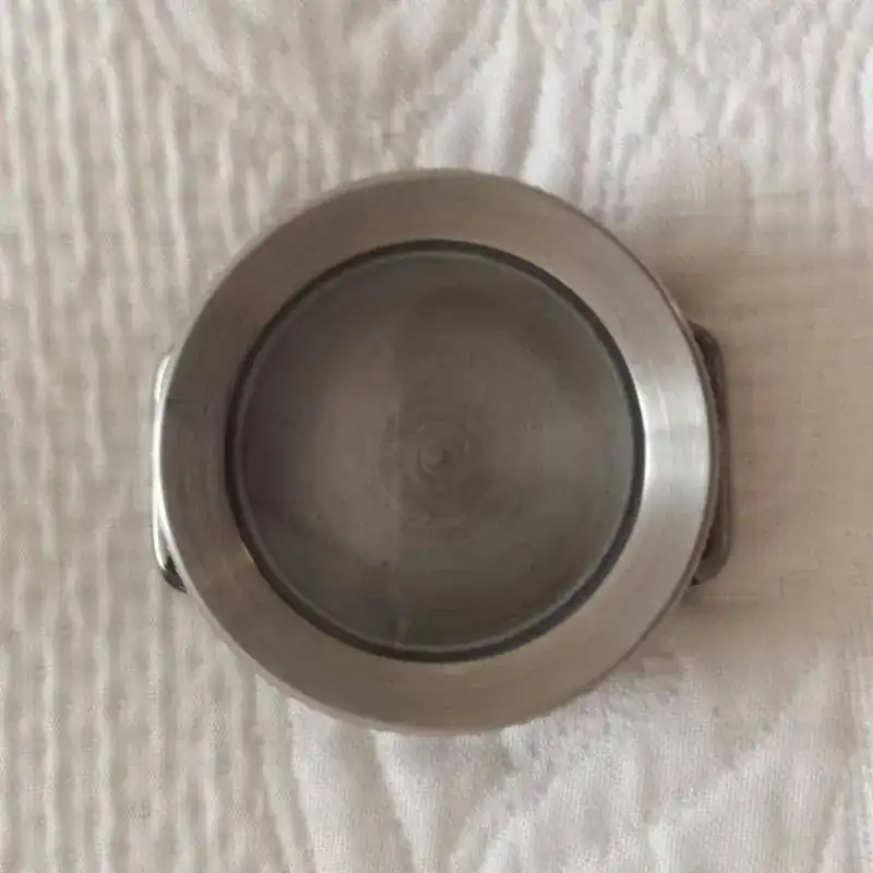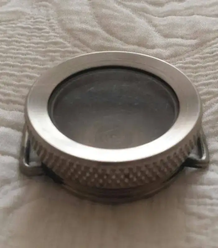 Es de acero Inox, tiene 42 mm de diámetro, cuenta con un bisel cuadrillado que se fija a rosca, plexi y junta de goma. Las asas parecen diseñadas para pasar una correa al estilo de las Nato.