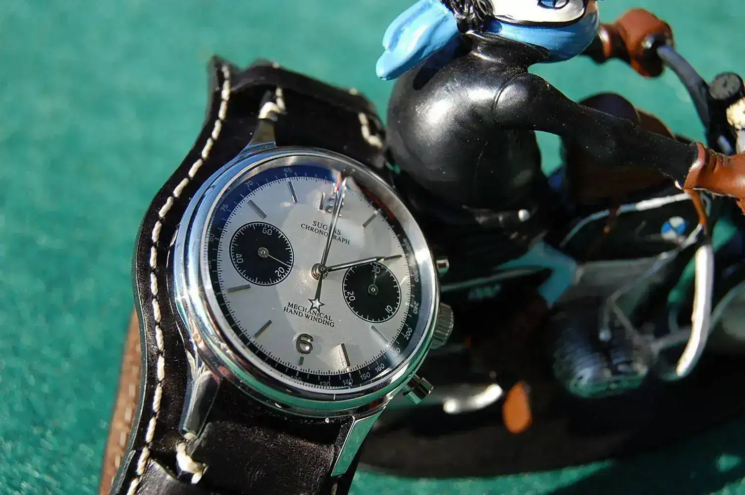 El otro es el EMG DL63, que próximamente va a reeditarse con algunos cambios. El calibre es el mismo Seagull del anterior, aunque no sé si equipará el "cuello de cisne" (intuyo que sí). La gran ventaja del EMG es que estará disponible en versión panda normal y el inverso (azul oscuro/blanco), que creo me atrae tanto o más que el normal, y el Sugess no dispone de dicha versión (sólo hay panda normal blanco/negro). Los acabados parecen ser superiores al Seagull, aunque también lo será su precio (estimo que mínimo 300 eur). Otra ventaja es su correa tipo rally marrón, que es justo la que quiero para este reloj. En el caso del Sugess tendría que comprarla aparte, cosa que tampoco es mayor problema.