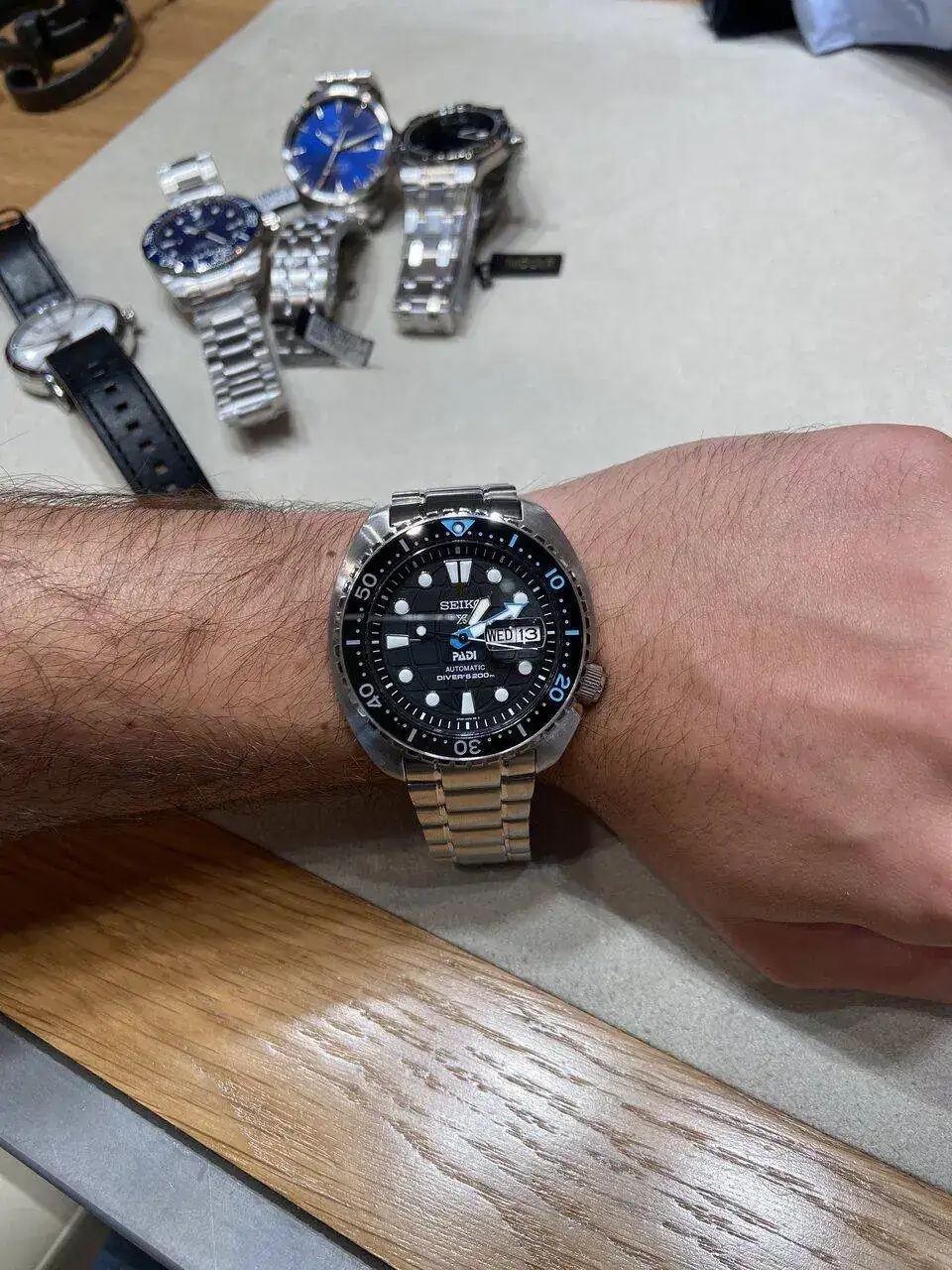 Me dieron a probar en la joyería el Seiko rey Tortuga. Reloj que no tenía en mente por su gran tamaño, pero que la verdad que puesto me resultó más cómodo de lo que pensaba. El precio de este reloj eran 660 euros, de primeras no me hicieron rebaja del precio oficial.