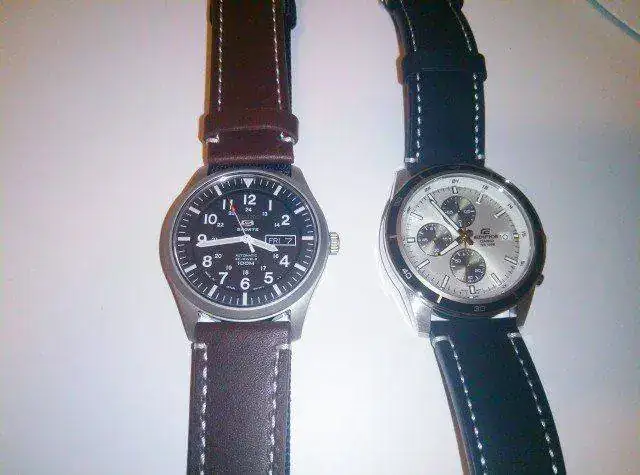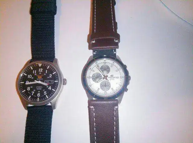 Ayer recibí un SNZG15J1, desde el primer momento tenía claro que iba a cambiar la correa de tela original por una de cuero, en un primer momento pensé en una de cuero marrón café con pespunte blanco, la combinación de dial negro / correa marrón me chocaba en un primer momento, pero creo que queda bonito. El caso es que tengo por casa un Casio Edifice con idéntico ancho de asas y una correa igual pero en negra, el caso es que creo que igual si las intercambio quedaría mejor (el Casio originalmente trae una correa coco marrón muy oscura)