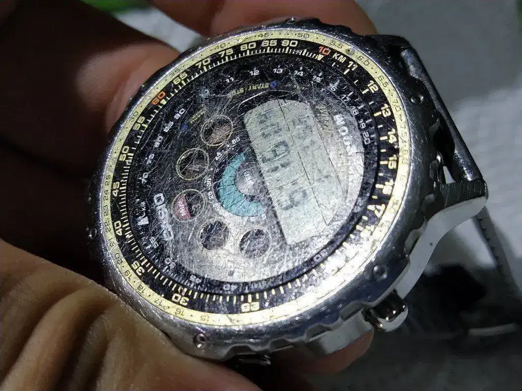 El estado del cristal es lamentable, aunque ya sabéis que depende mucho de cómo incide la luz y el ángulo de modo que es totalmente "visible" pese a su aspecto "destrozado". El módulo funciona perfectamente y la correa ahora no es algo que me preocupe, pero quiero tratar de mejorar el estado del cristal.
