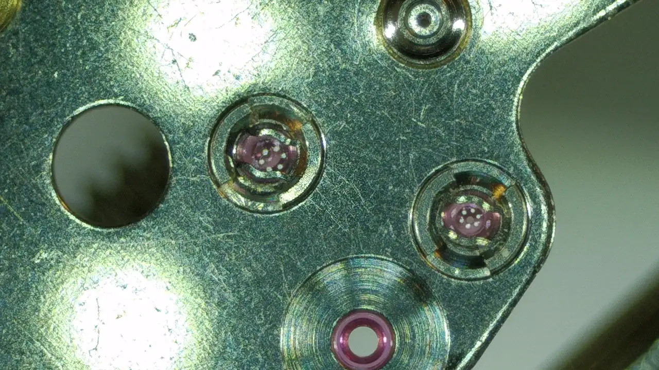 A ver... He hecho esto muchas veces. Incabloc, diafix, diashock de tres puntas... Pero este diashock en miniatura de un 7s26 me hace subirme por las paredes. Es un sistema ideado por el mismísimo Satanás de los relojes. ¡Pura maldad concentrada! La cosa es que el de dos puntas es más difícil de poner que el de tres y, a diferencia de los situados en el balance, este es mucho más pequeño y la joya va a pelo sin sujeción. Además de lo difícil que es de manipular y lubricar, luego está este resorte infernal. ¿Algún consejo?