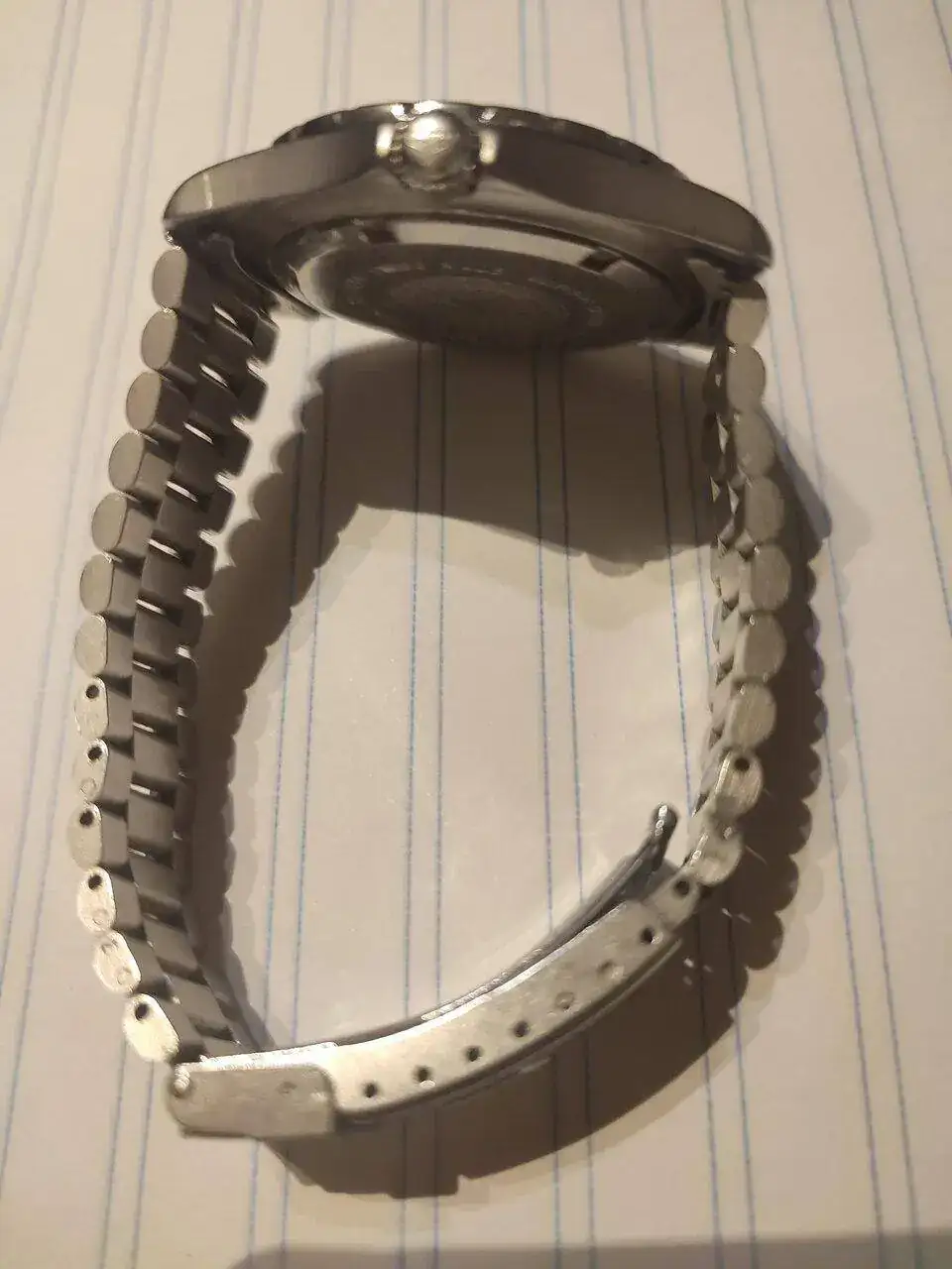Y lo que más me llama la atención es el "machaqueo". ¿Qué acero de primera calidad admite esa cantidad de erosiones? Pues para mí que es cobre o latón. O sea, no es acero. Y ya vamos mal. Luego miramos lo que es mirable de un reloj, la esfera y el brazalete. Y... no parece.
