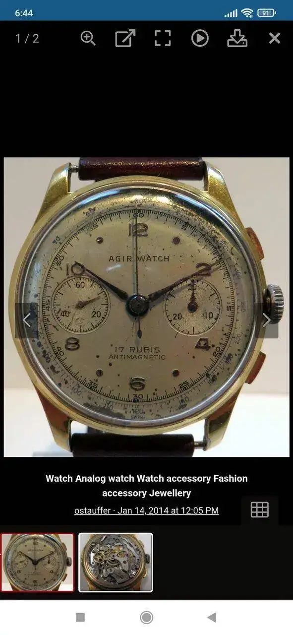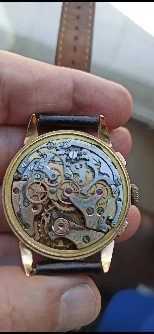 Estimados colegas del foro estoy tratando de identificar que marca es movimiento, agir watch 35 mm mecánico y bicompax además de su identificación, la caja es oro 18 genérica y busco su cuadrante original. Muchas gracias