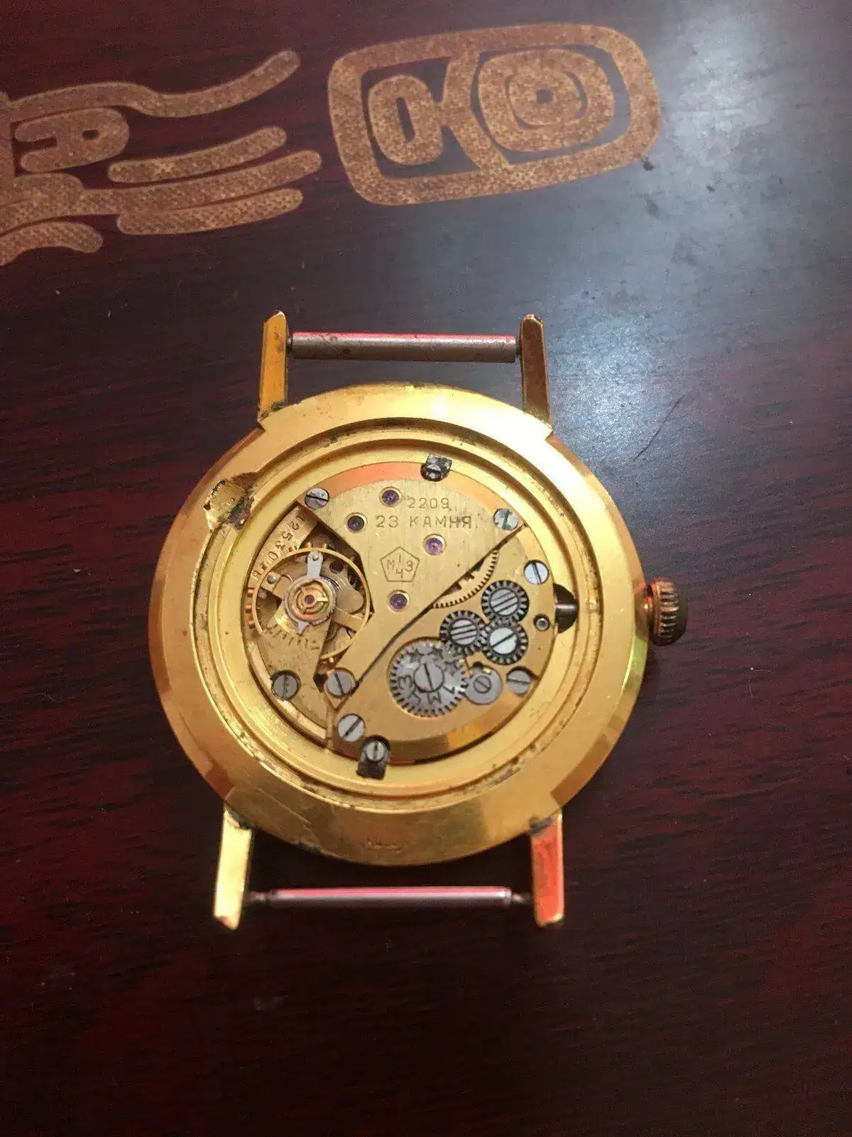 Si le pides a algún moderador que te lo mueva al subforo de rusos, te darán más información. Pero te puedo adelantar que es un calibre Poljot 2209 de la 1ª fábrica de relojes de Moscú (1m43) con el logo que se estampaba a partir de 1965. Las estrellas son simple decoración. En sus tiempos llego a ser uno de los calibres más planos que se hicieron, con segundero central. Estaría bien ver la parte delantera. :)