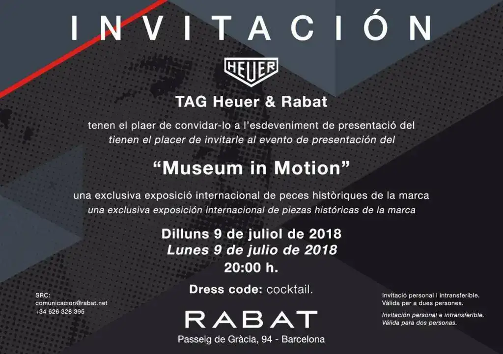 dicho en corto: están todos los foreros de RE invitados el lunes por la tarde, a partir de las 20 horas a una presentación muy especial: el museo de TAG-Heuer (léase Heuer) se ha hecho itinerante y para unos días en Barcelona, y Rabat nos ha reservado el próximo lunes día 9 para Relojes Especiales.