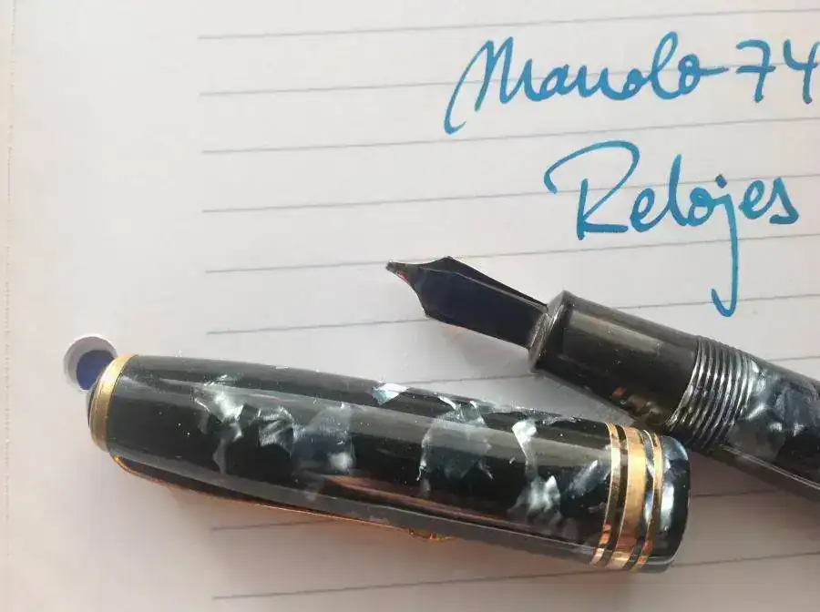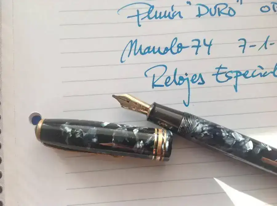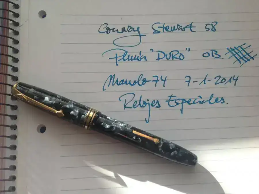 vendo una magnífica pluma clásica, una CS 58, en azul marmolizado. Monta un plumín OB de trazo muy agradable, jugoso y fácil de usar. La muestra de escritura está hecha con la propia pluma. El plumín es de oro y es un "DURO", los considerados gama alta dentro de los plumines CS, y no es fácil encontrarlos con OB. No es flexible.