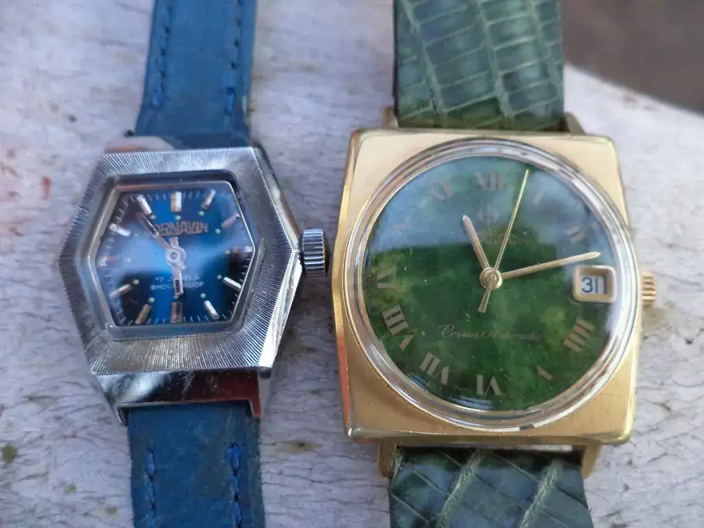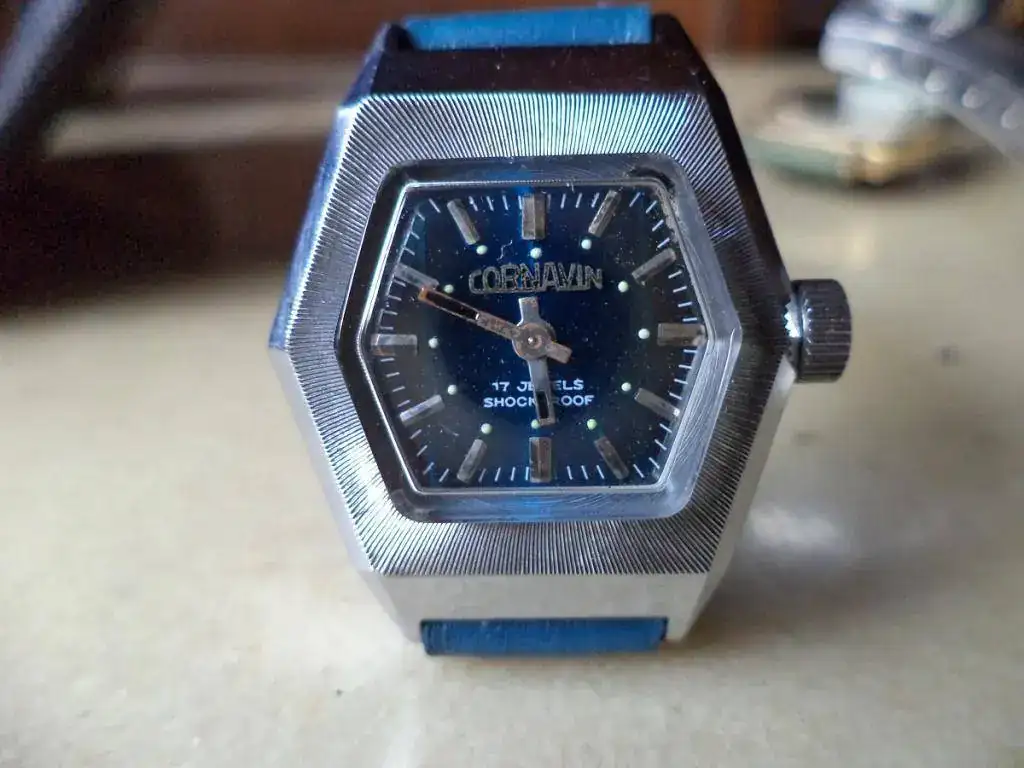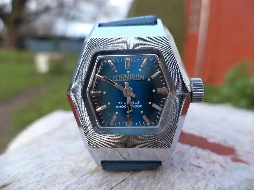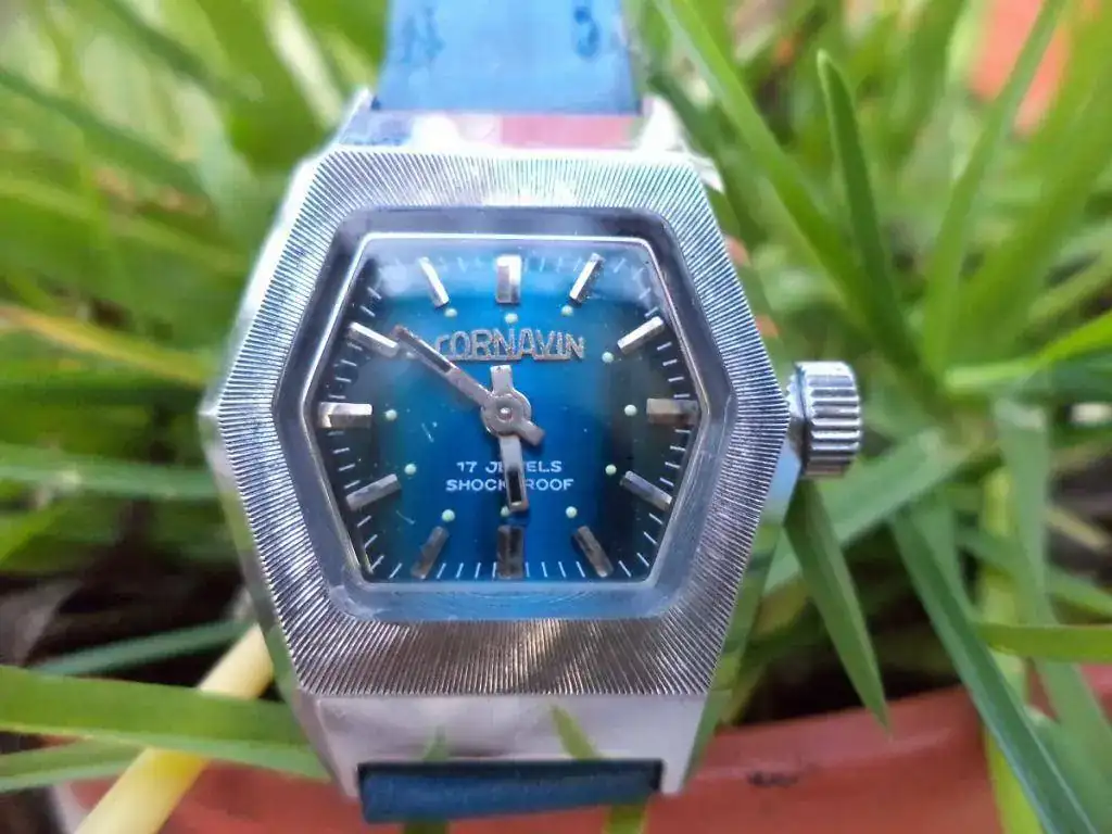 Este pequeño Cornavin azul es una belleza inocente y extrema: el prototipo perfecto de reloj bonito, bueno y barato. Dejo en un segundo y ausente plano su calibre, que no viene al caso aquí - teniendo las herramientas me ha dado pereza abrirlo - y también dejo a los amables y pacientes lectores de este hilo la sutil y didáctica tarea de descubrir, por estética, a qué período de la zarandeada Cornavin pertenece. La pieza es NOS, lleva el sello de la extinta ANA ( Administración General de Aduanas, que no existe desde 1995 ) más un precinto de catalogación en el depósito fiscal donde durmió todos estos años que dice "1977".