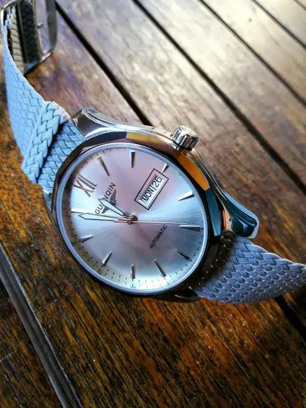 Lo dicho. Espectacular.En mi caso tengo un Guanqin de dial gris claro con una perlón gris... Por si te sirve de orientación...