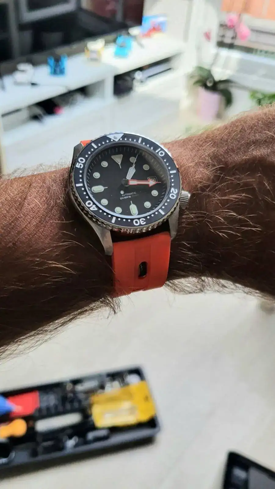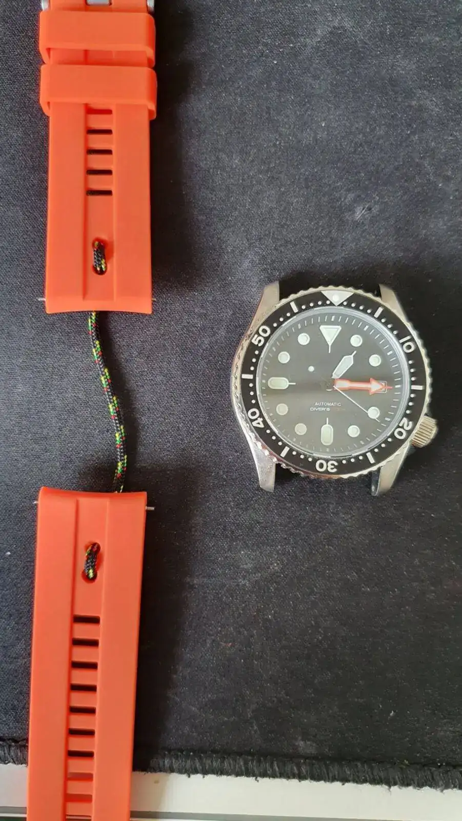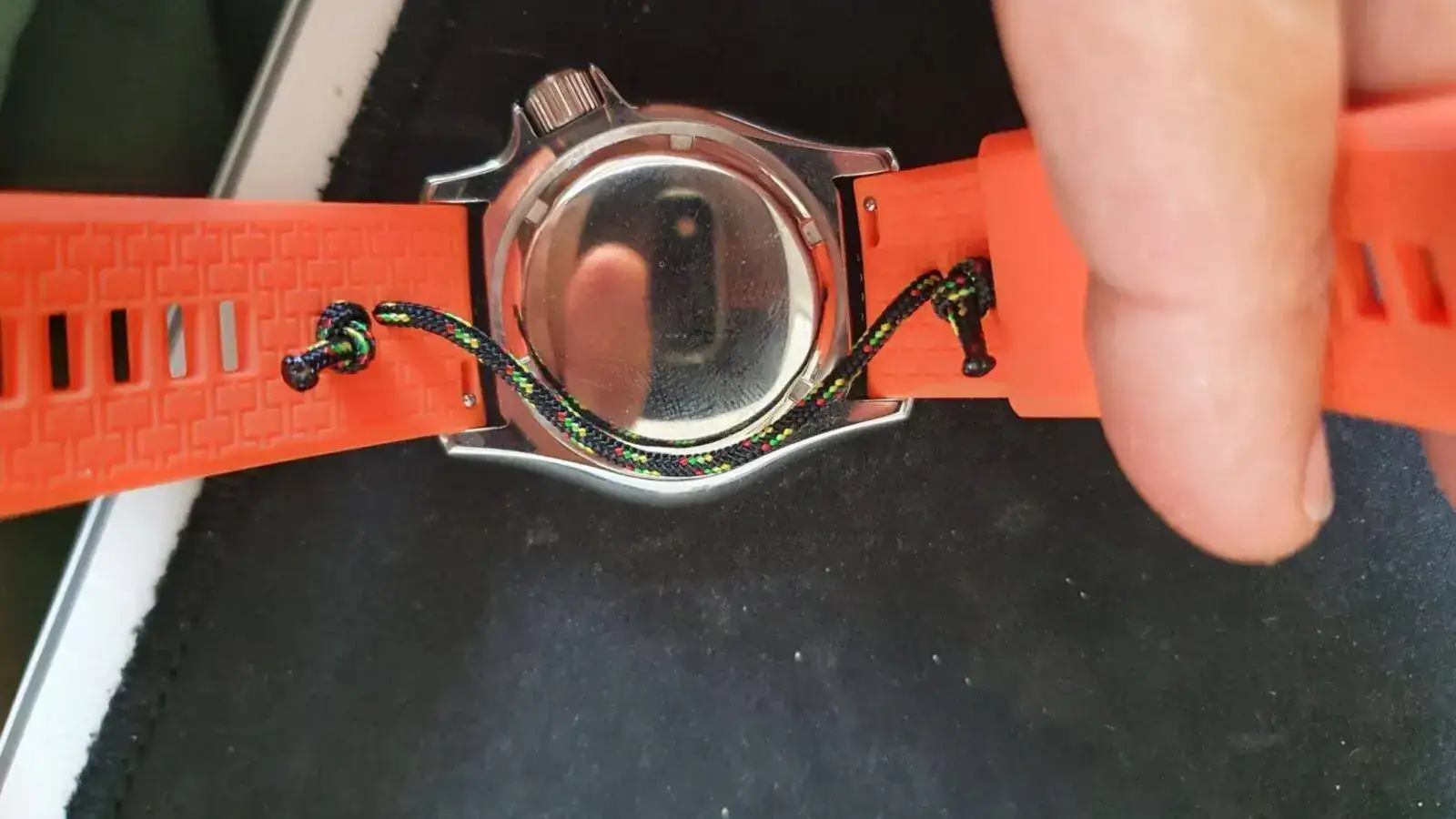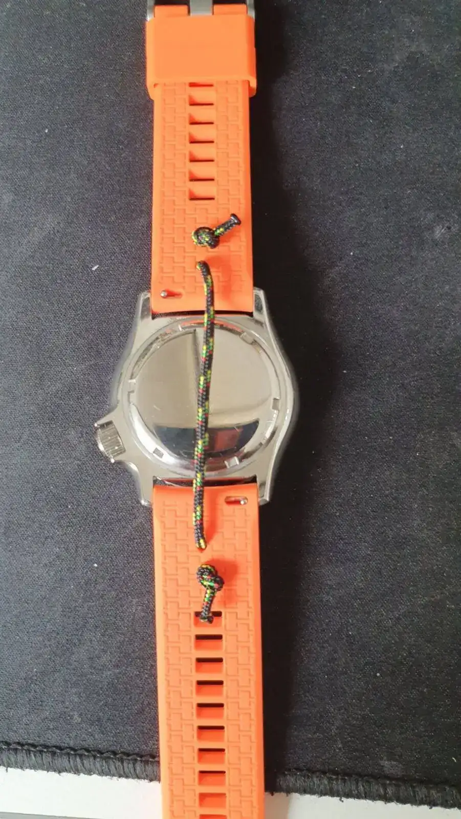 Uso mis relojes automáticos para hacer deporte. De hecho, los monto para eso. Uno de los problemas a los que suelo enfrentarme es al miedo de que salte un pasador y perder el reloj, por lo que muchas veces opto por utilizar una nato, que además resisten mejor la ducha posterior. Esa es una de las especificaciones básicas. El reloj debe de ir bien sujeto durante la actividad (principalmente ciclismo) y además resistir la ducha posterior para limpiar reloj y correa. Pero las natos, al margen de consideraciones estéticas, separan el reloj de la muñeca. Los brazaletes clásicos son mejores en ese sentido, pero volvemos al primer punto, el miedo a perder el reloj si salta un pasador. Por eso he ideado esto. Supongo que existan cosas parecidas, pero igual a alguien le sirve como idea. Una vez puesto, en la muñeca no se nota, pues el cordino se recoloca naturalmente alrededor de la tapa del reloj. Se puede afinar más estéticamente, pero creo que con estas tres imágenes se entiende perfectamente.