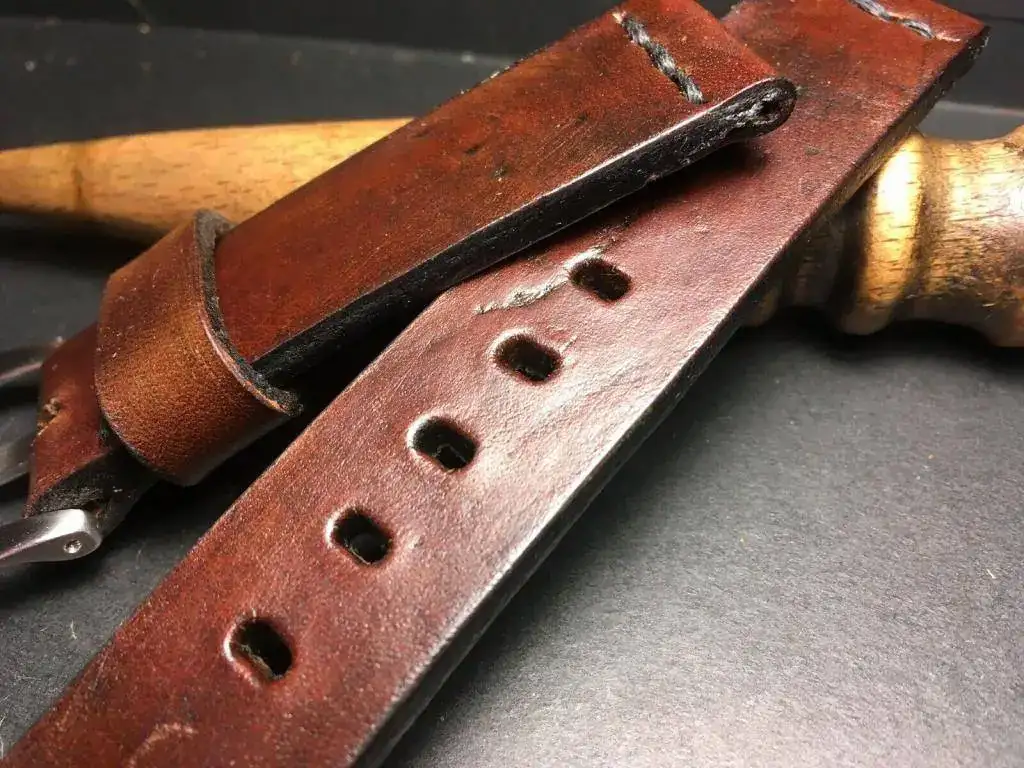 Pero esa correa requería una selección, alguien había elegido esa correa específicamente y eso no se encuentra en cualquier sitio. Además era evidente que estaba confeccionada a mano. Así que descarté mi pudor a preguntar y allá que fui. En cuanto le pregunté una sonrisa brotó de su cara (y eso que es un compañero muy serio, ¡pocas veces le he visto sonreir!), en seguida me comentó que era una correa fabricada a mano con nada menos que el cuero de unas antiguas alforjas de munición. En este caso del ejercito Suizo. "Esto no se encuentra en la relojería de al lado..." repliqué, ¿dónde has encontrado esto?. Al parecer debe haber gente que trabaja con estos cueros y los vende en ebay. Tras mucho bucear en su móvil finalmente encontró al vendedor el cual añadí rápido a mis favoritos.