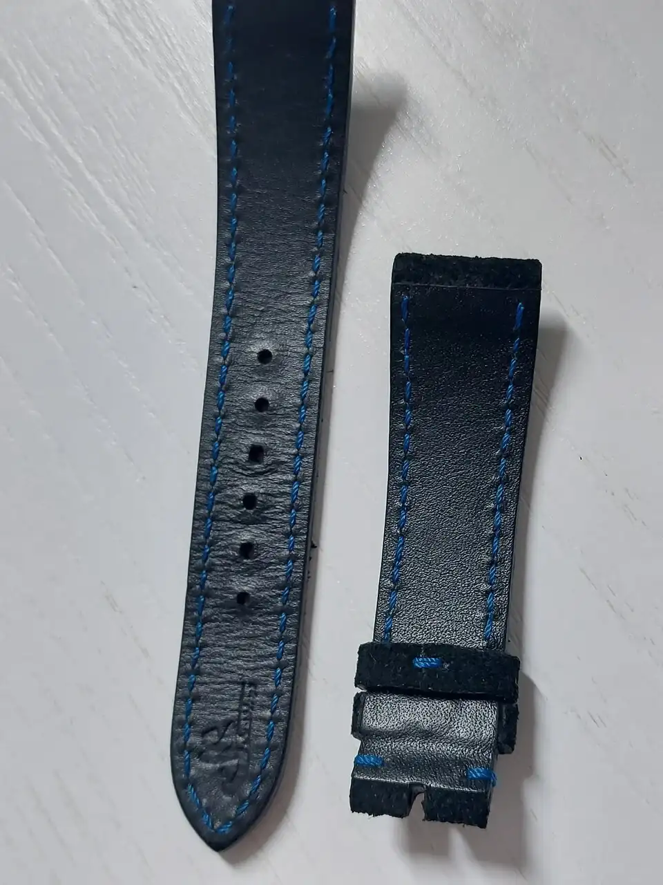 El material es piel tipo ante color negro con pespunte azul