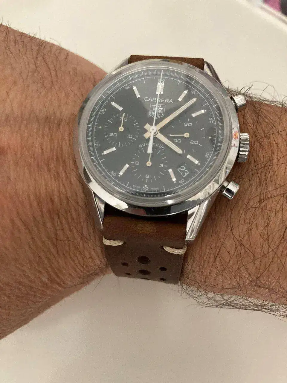 Últimamente cada vez que veía un reloj con esfera negra y con una correa marrón "rústica" se me iban los ojos, me gusta mucho esa combinación. Contacte con el compañero @Zero y pedí un par, una para un Duward que restauré (ya la presenté) y otra para el Carrera, en este caso una tipo Rally ya que no concibo un Carrera con otro tipo de correa, no se verlo, una manía como cualquier otra