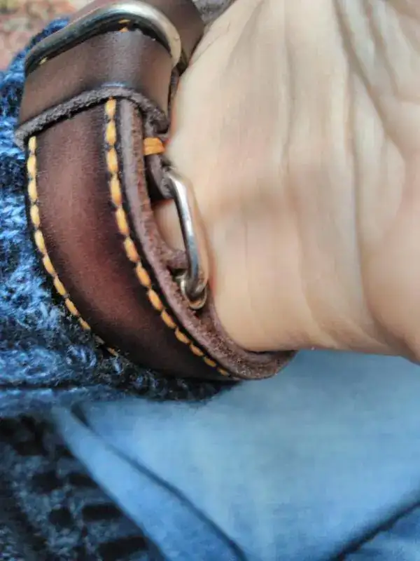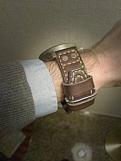 También llevo mucho tiempo y hacer algún prototipo conseguir que siendo una correa cerrada (al mas puro estirlo flieger) para ponerla como un armis, entrara por mi puño y luego no me sobrara la correa justa para que se vieran los remaches y el triangulo cosido. Ahora mismo está nueva, pero en cuanto se ajuste y poco y se de de sí, puedo recuperar un agujero mas y quedará el sobrante justo hasta el pespunte de los remaches para lucirla perfecta.