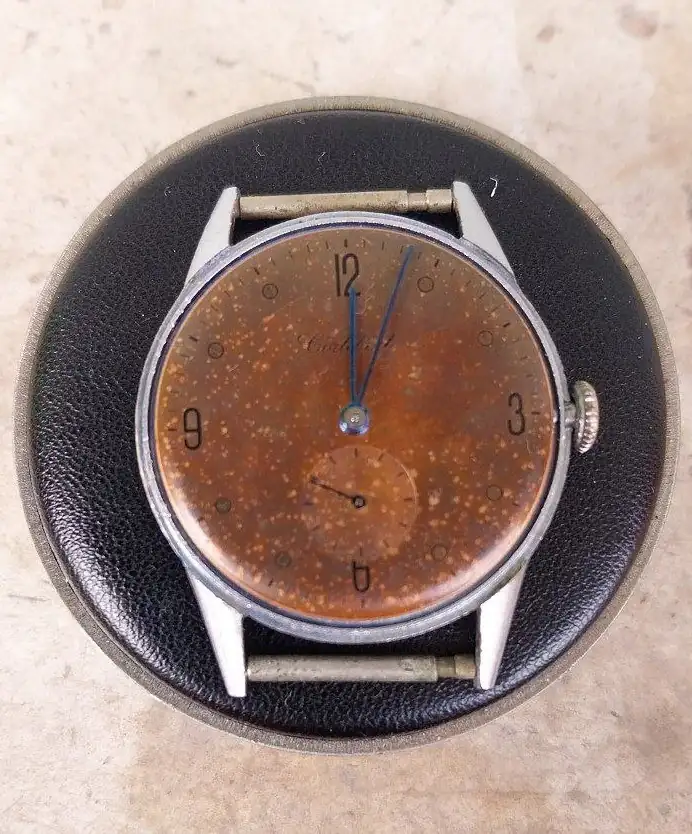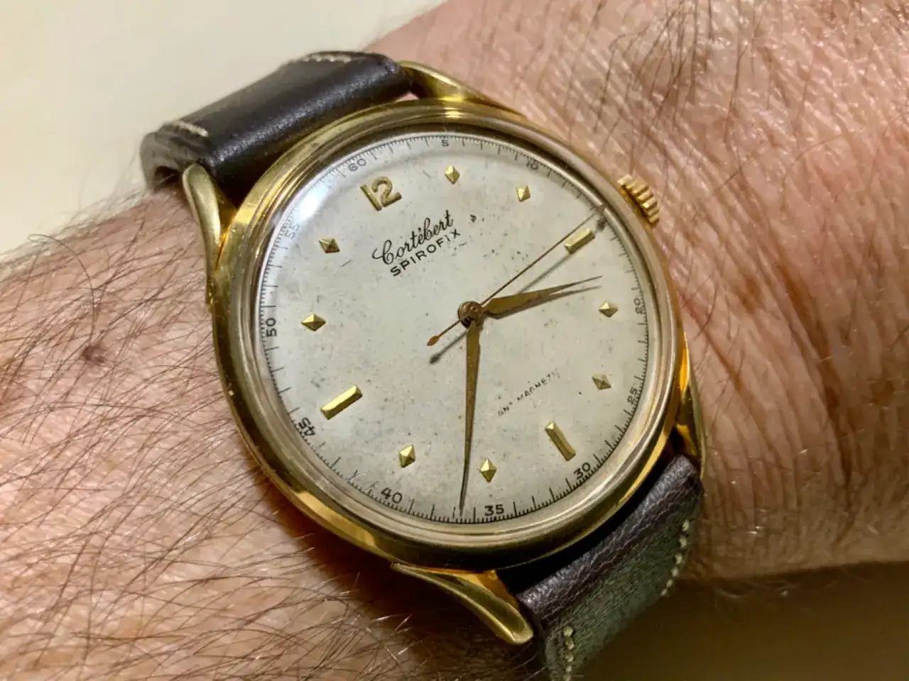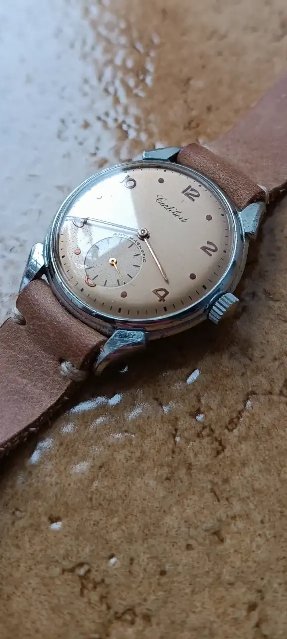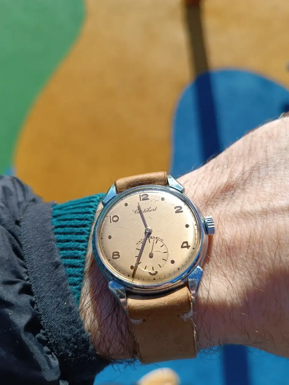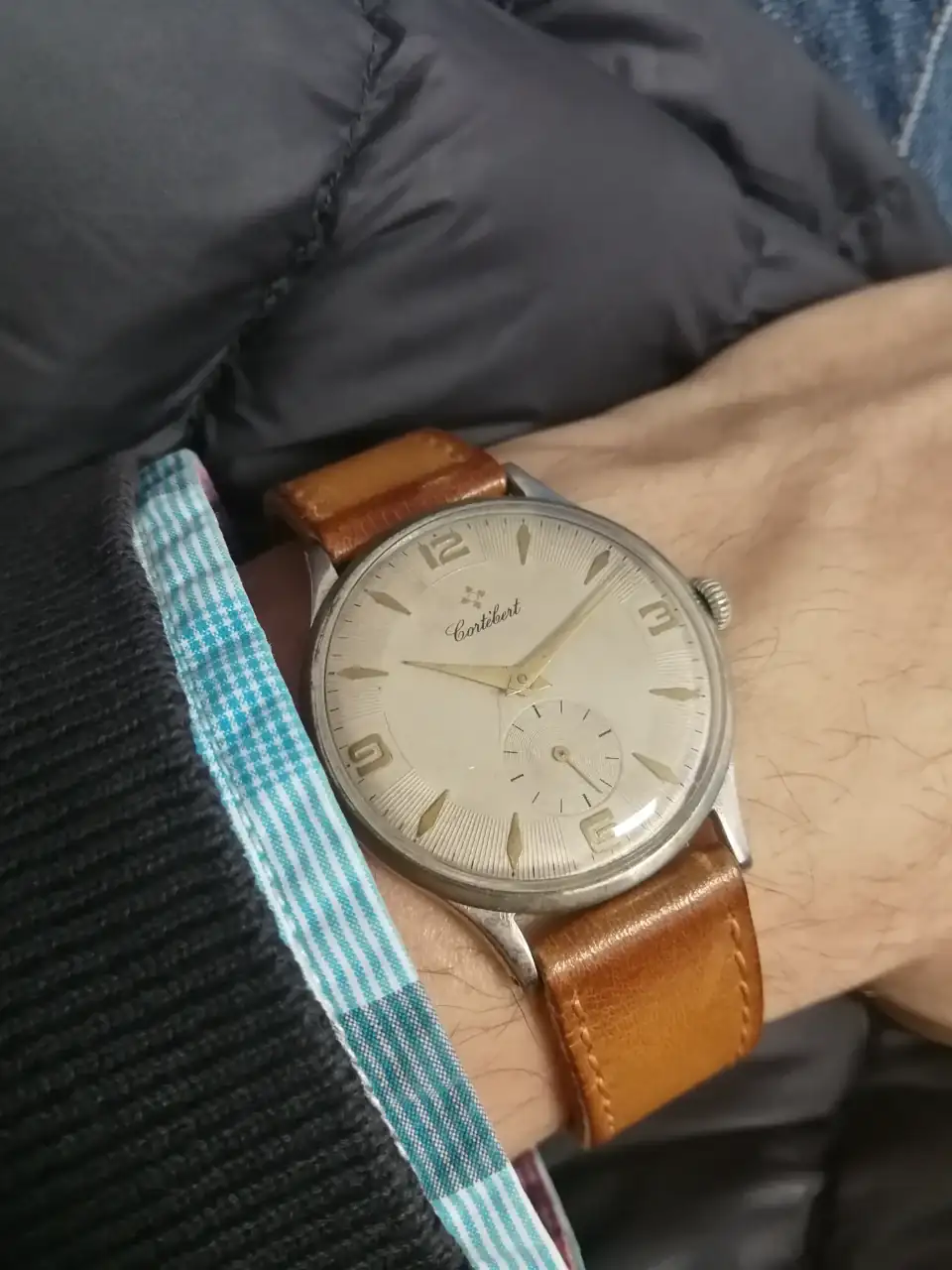 Aprovecho para mostraros como indica el titulo un Cortebert, con calibre 689 manufactura, si no estoy equivocado. Como podéis ver le falta el segundero, que según mi relojero creo recordar que me dijo que no tiene la espiga (si alguno de vosotros tiene una que le sobre, pues eso, o bien si sabe donde localizarla lo agradecería, pues me gustaría tenerlo completo). Si podéis me hacéis compañía con los vuestros, que sé que hay unos cuantos y bien bonitos por aquí, hasta alguno creo recordar con el mismo tipo de esfera (Kike).