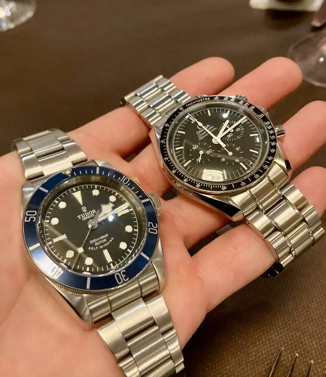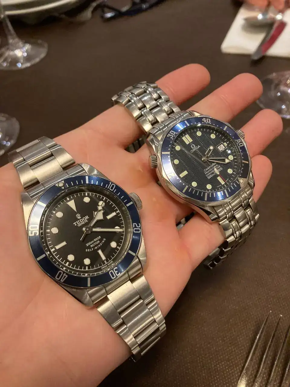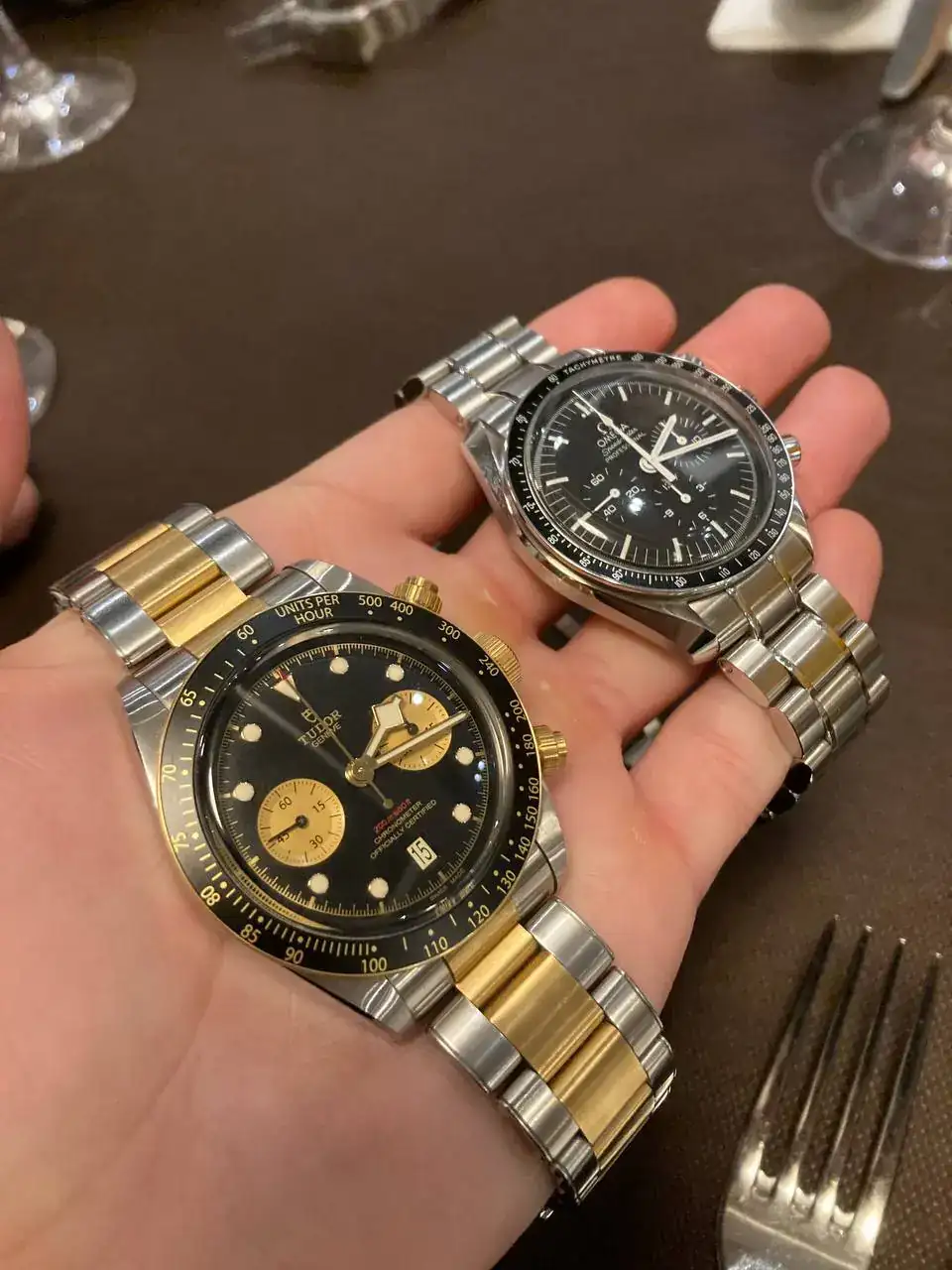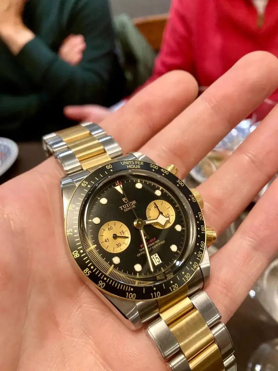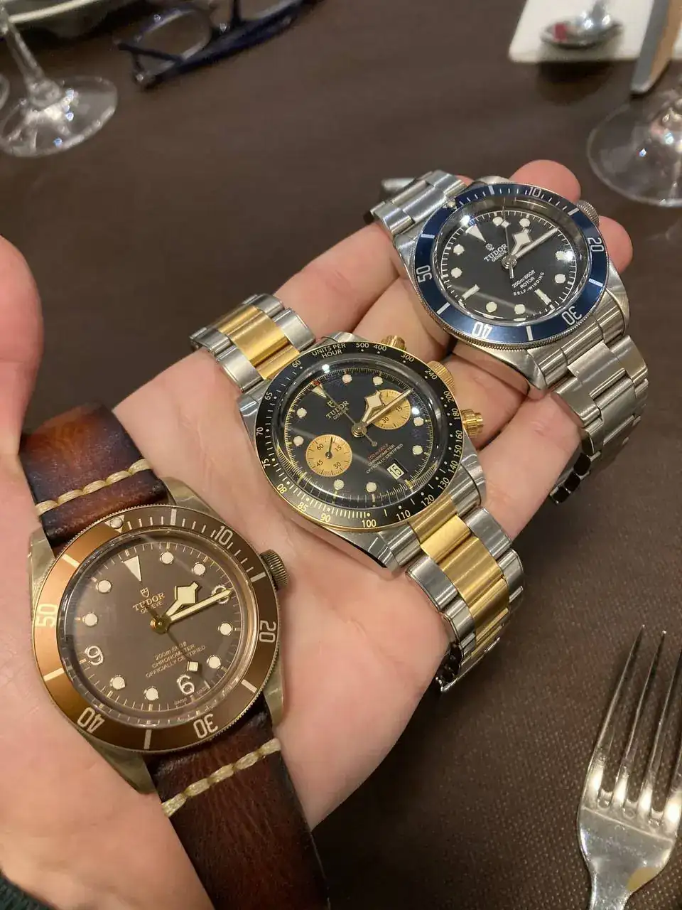 Mientras la comida y el vino iba y venía seguíamos con el reportaje fotográfico: trío de snowflakes. Black Bay Broze con su ¿dial Explorer? 3, 6, 9. Black Bay Chrono mixto y un Tudor Smiley.