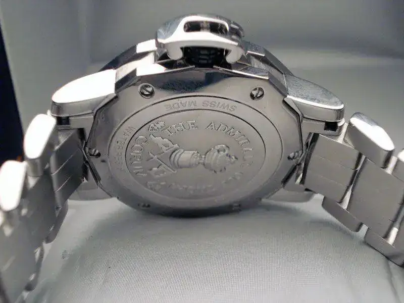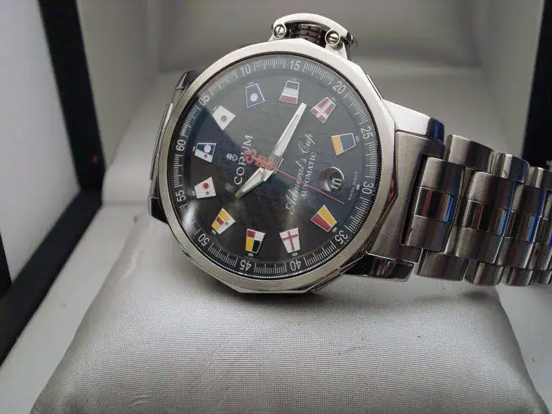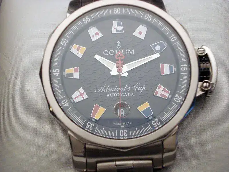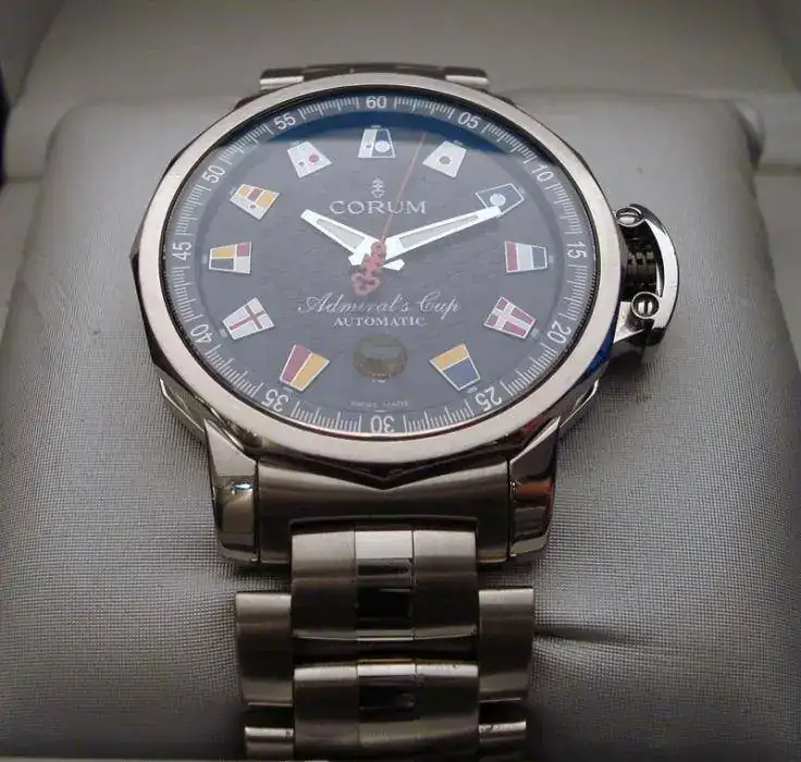 Observaciones :Corum Admirals Cup modelo Trophy, caja de acero de 41 mm, fecha a las 6, protector de corona, movimiento automático. Sumergible 100 metros. Esfera negra con olas en relieve, indices con banderas. Fondo ciego con emblema de admirals cup. Cristal de zafiro. Armis de acero.