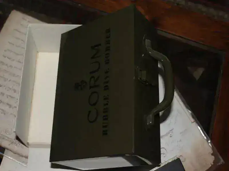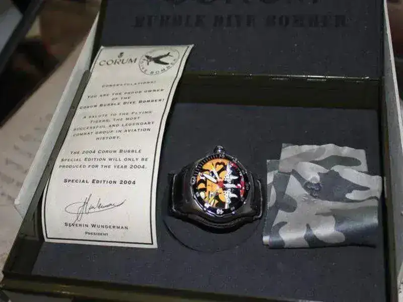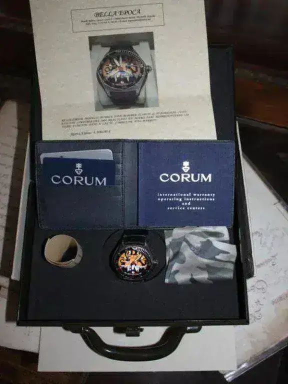 Hola buenas sale es este Corum Bubble Dive Bomber.con todos sus complementos caja de metal, sobre caja de la marca... ,paño Corum de camuflaje.... certificaciones, papeles y documentos.Completo. Una pieza muy especial.Con un p.v.p. aproximado en su dia de 4000 Euros.