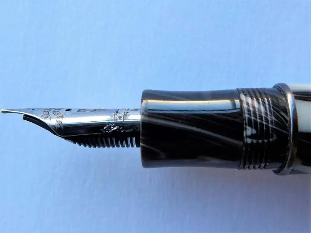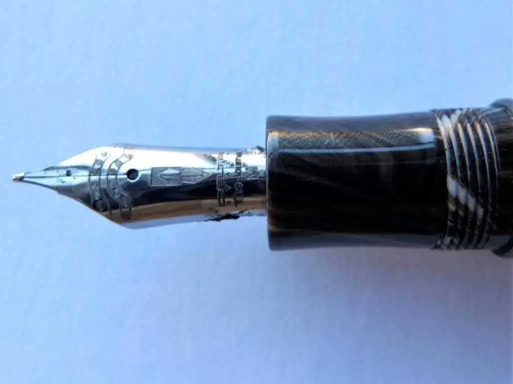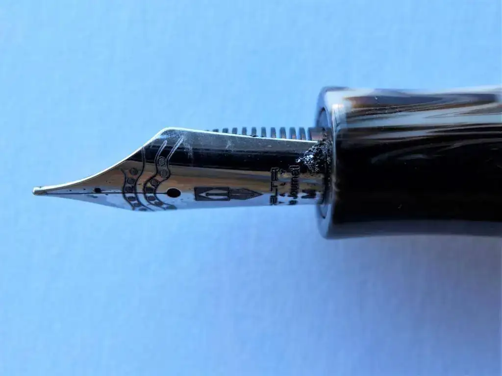 Este plumín es de acero y trae un revestimiento gunmetal (sic). Pues bien, este revestimiento reacciona con la tinta. Primero con la Delta y después (haciendo pruebas) con la montblanc. Cuando la tinta toca el plumín hace como pequeñas burbujas, espuma, y levanta el revestimiento dejando el acero al descubierto. Se puede limpiar pero se pierde el acabado satinado. Ahora se aprecia que el plumín tiene zonas satinadas y otras con el acero a la vista.
