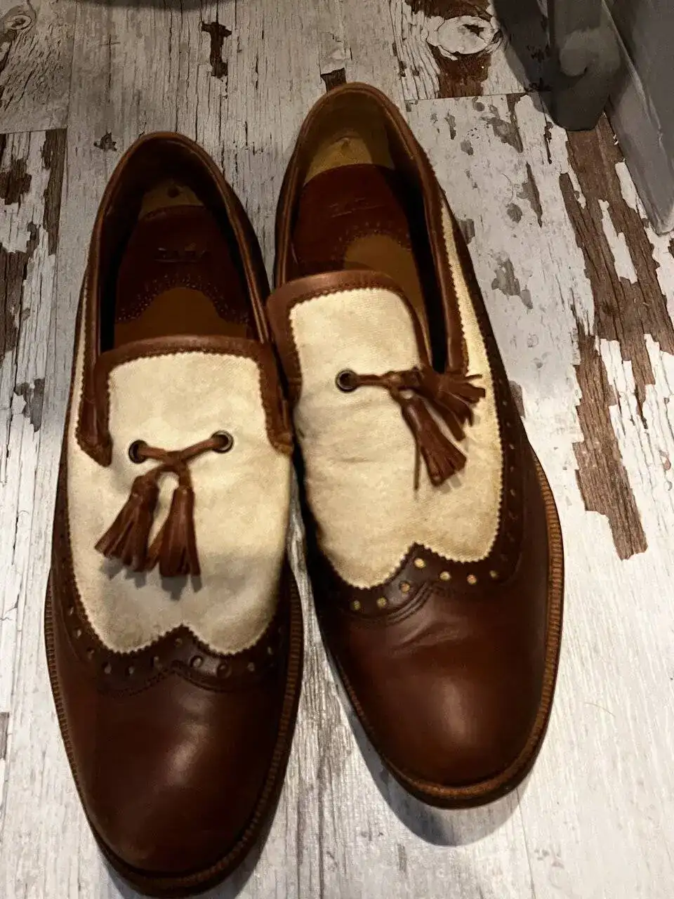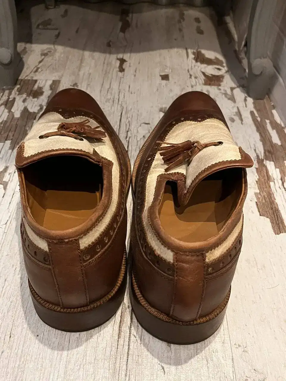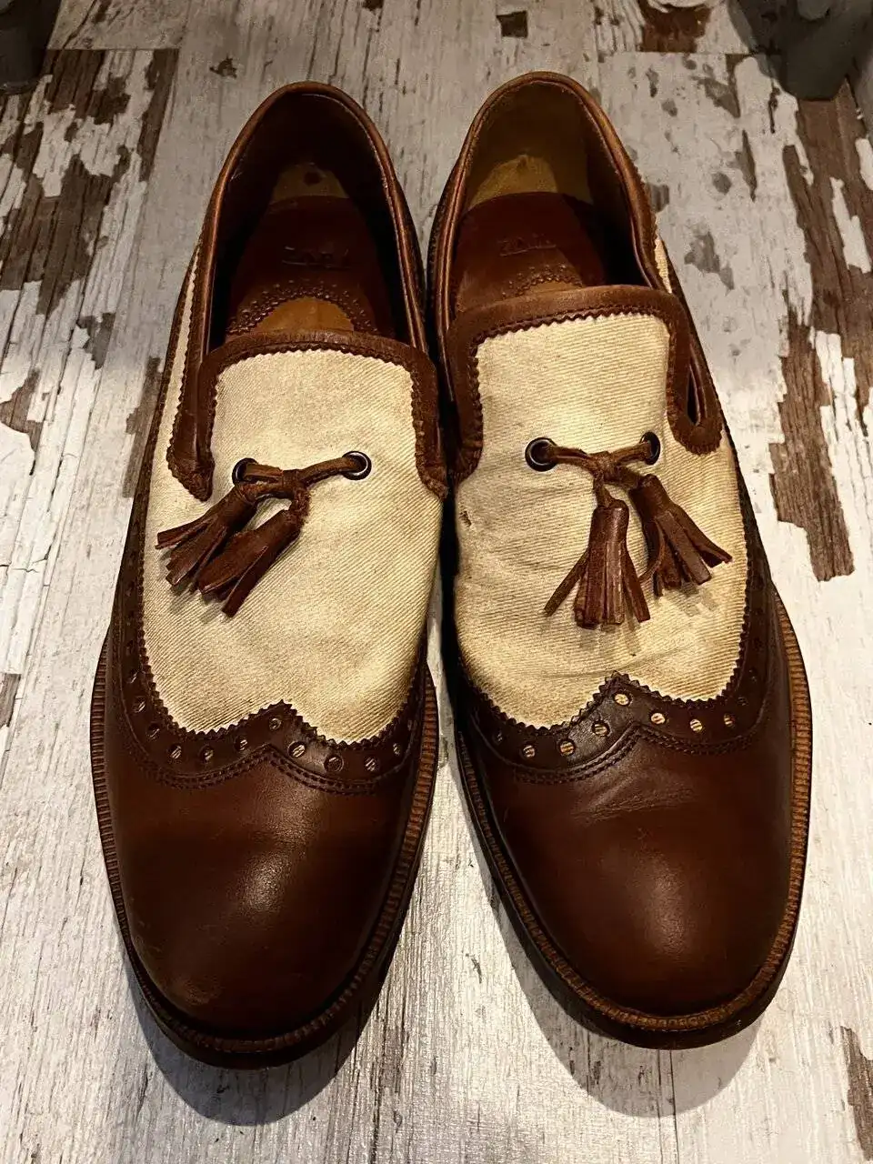10 . Mocasines de Zara en piel marron y tela blanca usados pero en perfecto estado. 15 euros.