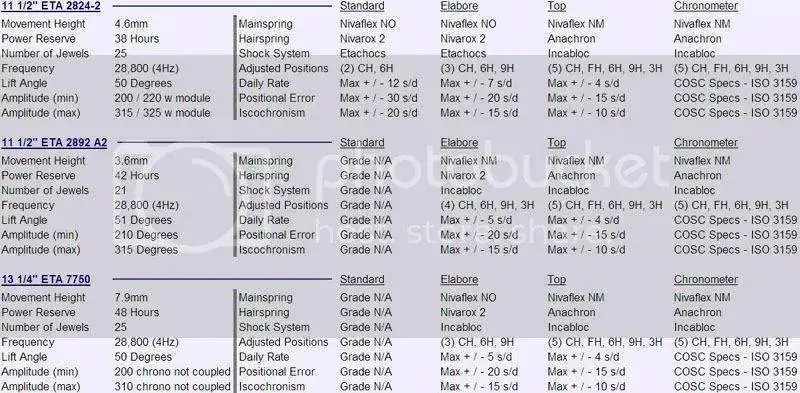 Sin entender mucho, me llama la atención que en los 3 calibres, el grado determina las características (idénticas), a excepción del Elaboré 2892 A2, que parece un poco superior a los Elaboré de los otros calibres.@jmnav Yo tenía guardada esta tabla, pero creo que hay alguna diferencia de materiales, además de las que vienen en la tabla.